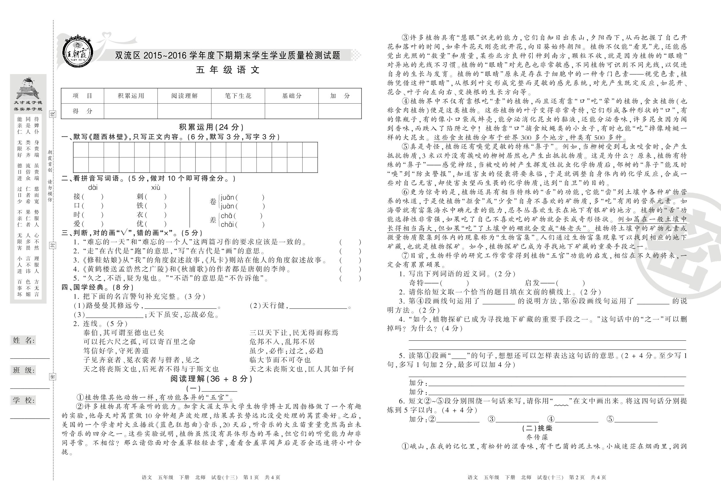 2015-2016学年第二学期成都市双流区五年级语文试卷(北师版)【13】