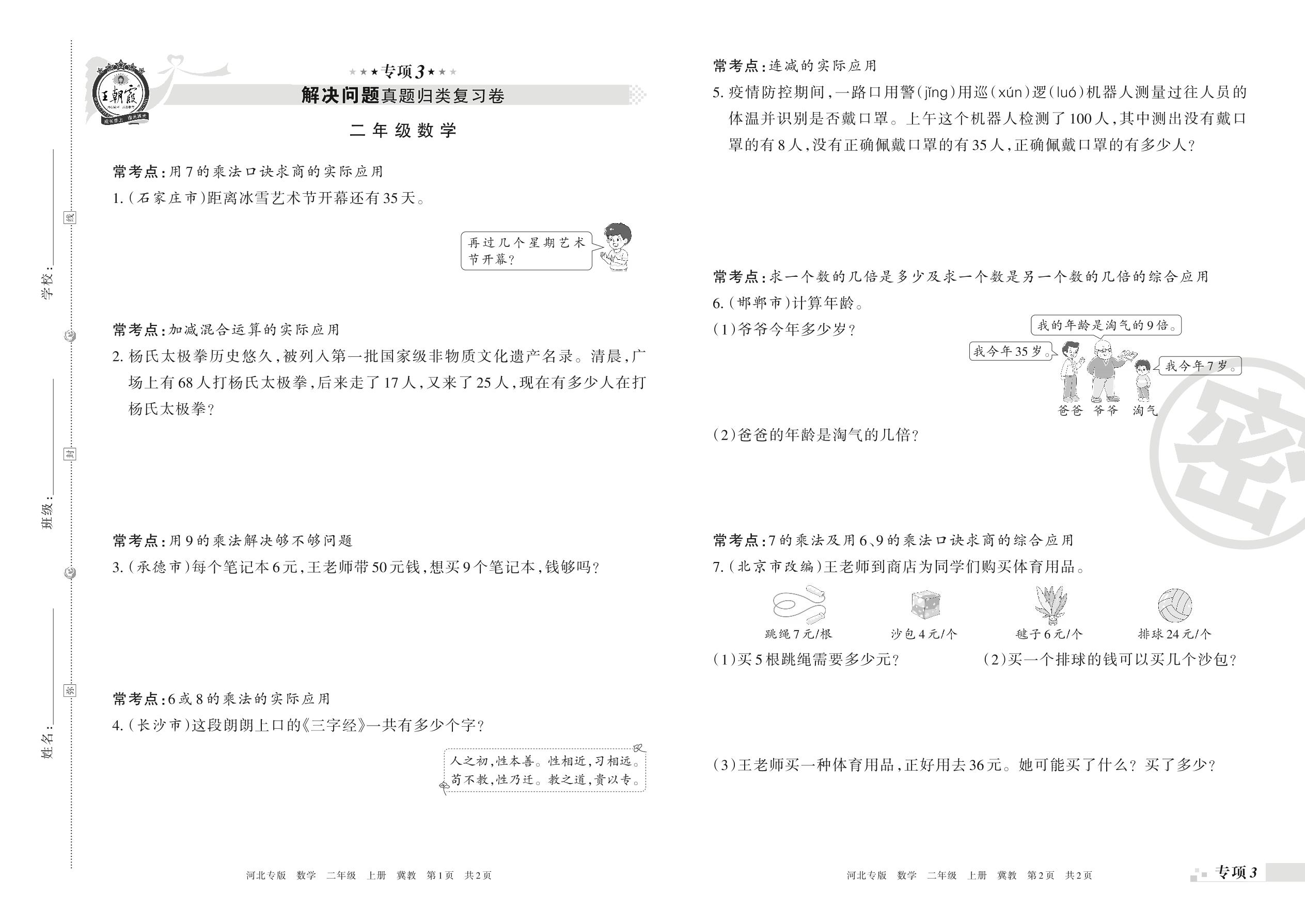 王朝霞期末专项卷——解决问题真题归类复习卷二年级上册数学(冀教版)【3】