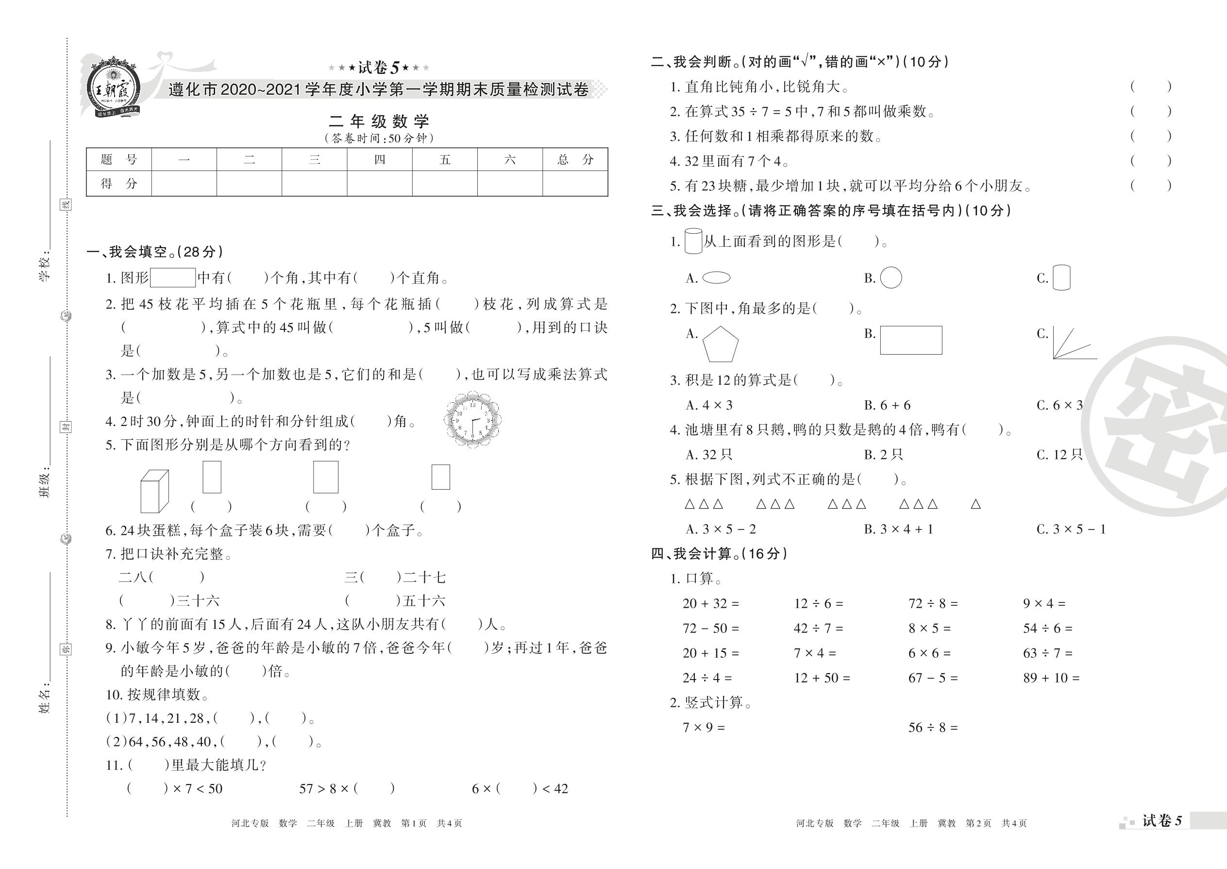 遵化市2020~2021学年度小学第一学期期末质量检测试卷二年级数学(冀教版)【5】