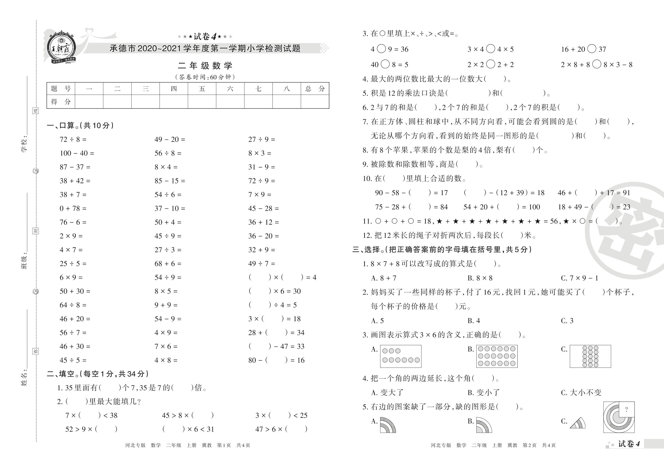 承德市2020~2021学年度第一学期小学检测试题二年级数学(冀教版)【4】