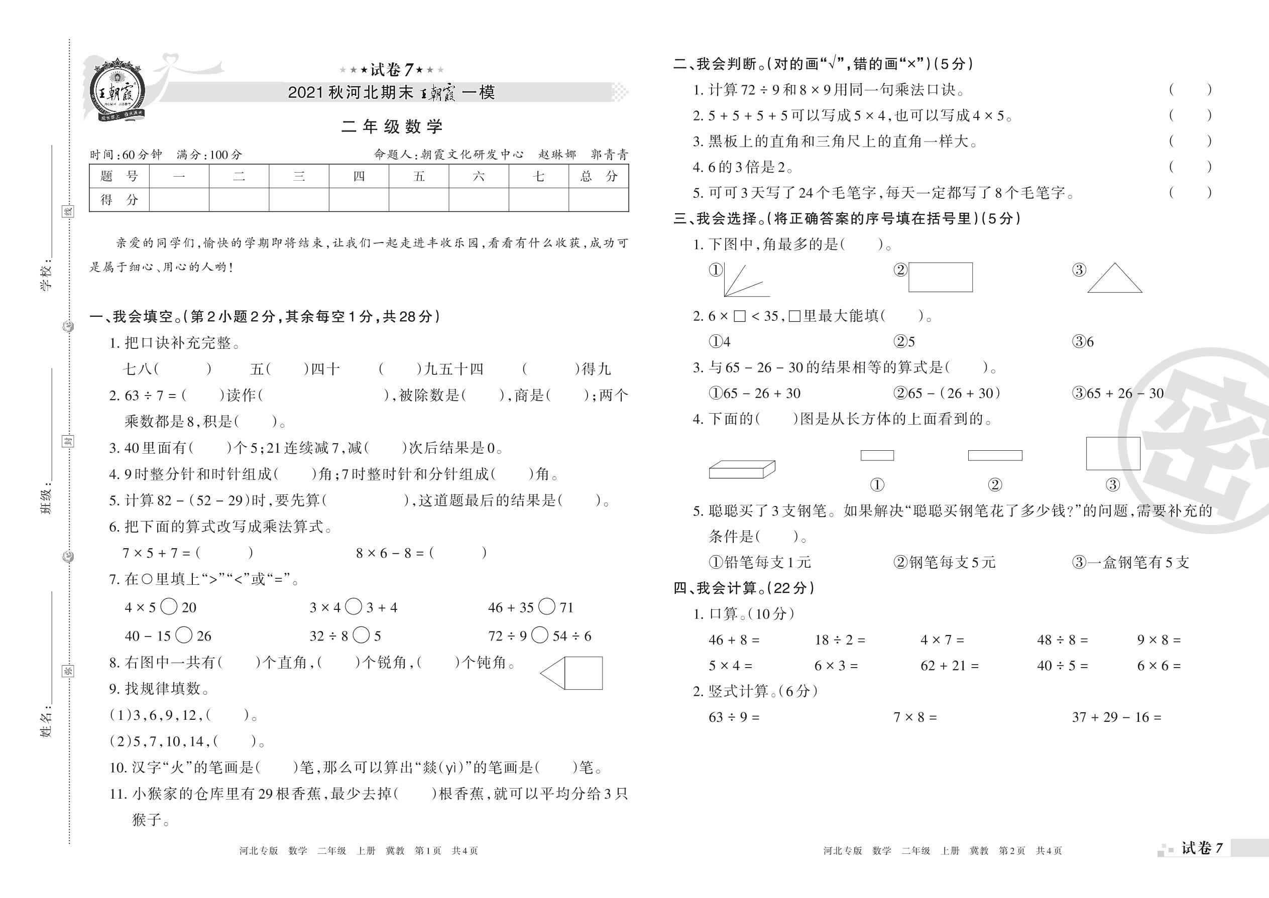 王朝霞期末模拟卷二年级上册数学(冀教版)【7】