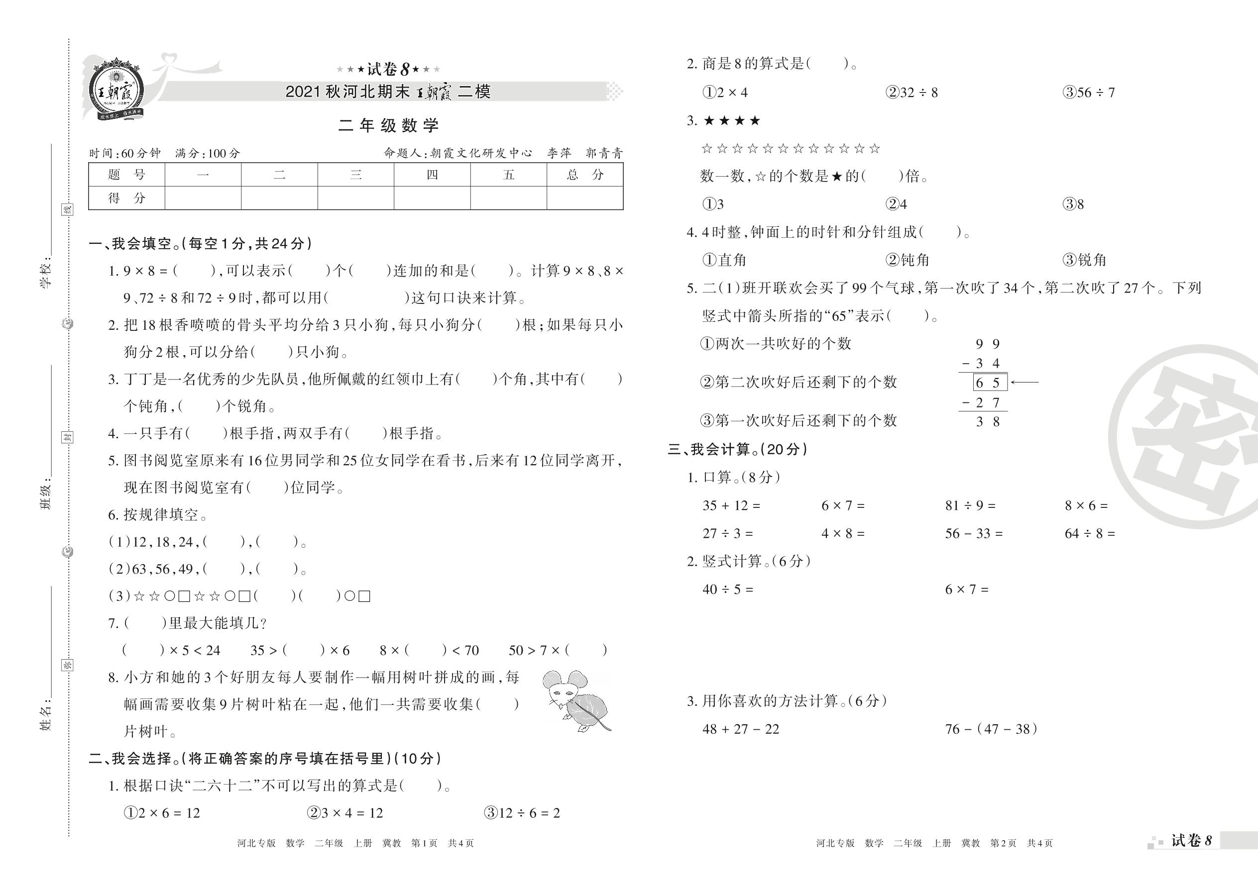 王朝霞期末模拟卷二年级上册数学(冀教版)【8】
