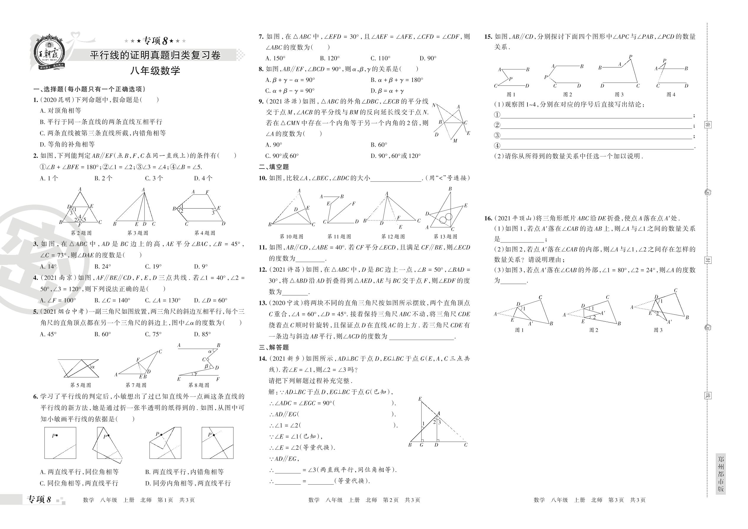 王朝霞期末专项卷——平行线的证明真题归类复习卷八年级上册数学(北师版)【8】