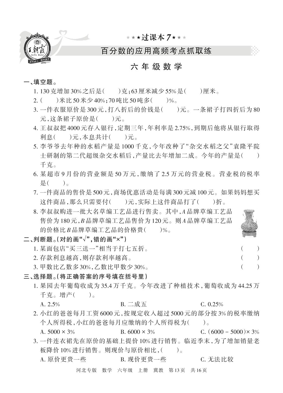 王朝霞期末过课本——百分数的应用高频考点抓取练六年级上册数学(冀教版)【7】