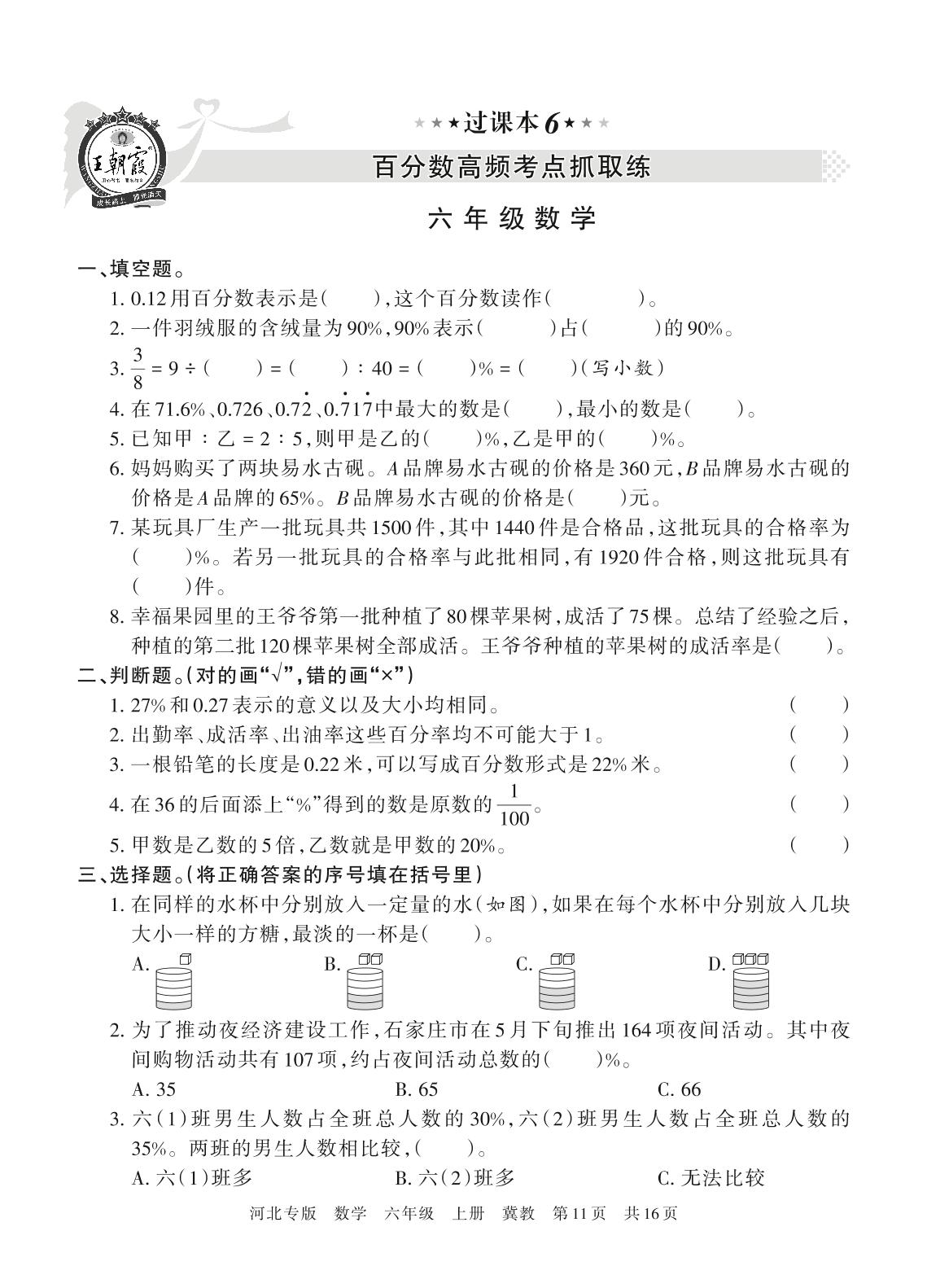 王朝霞期末过课本——百分数高频考点抓取练六年级上册数学(冀教版)【6】