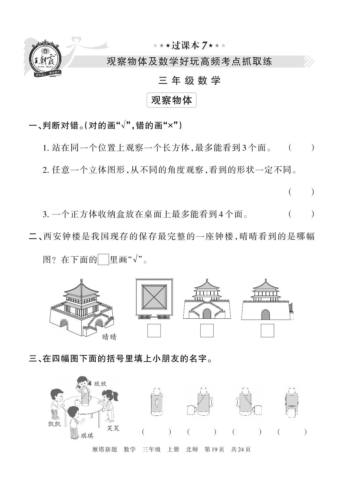 王朝霞期末过课本——观察物体及数学好玩高频考点抓取练三年级上册数学(北师版)【7】