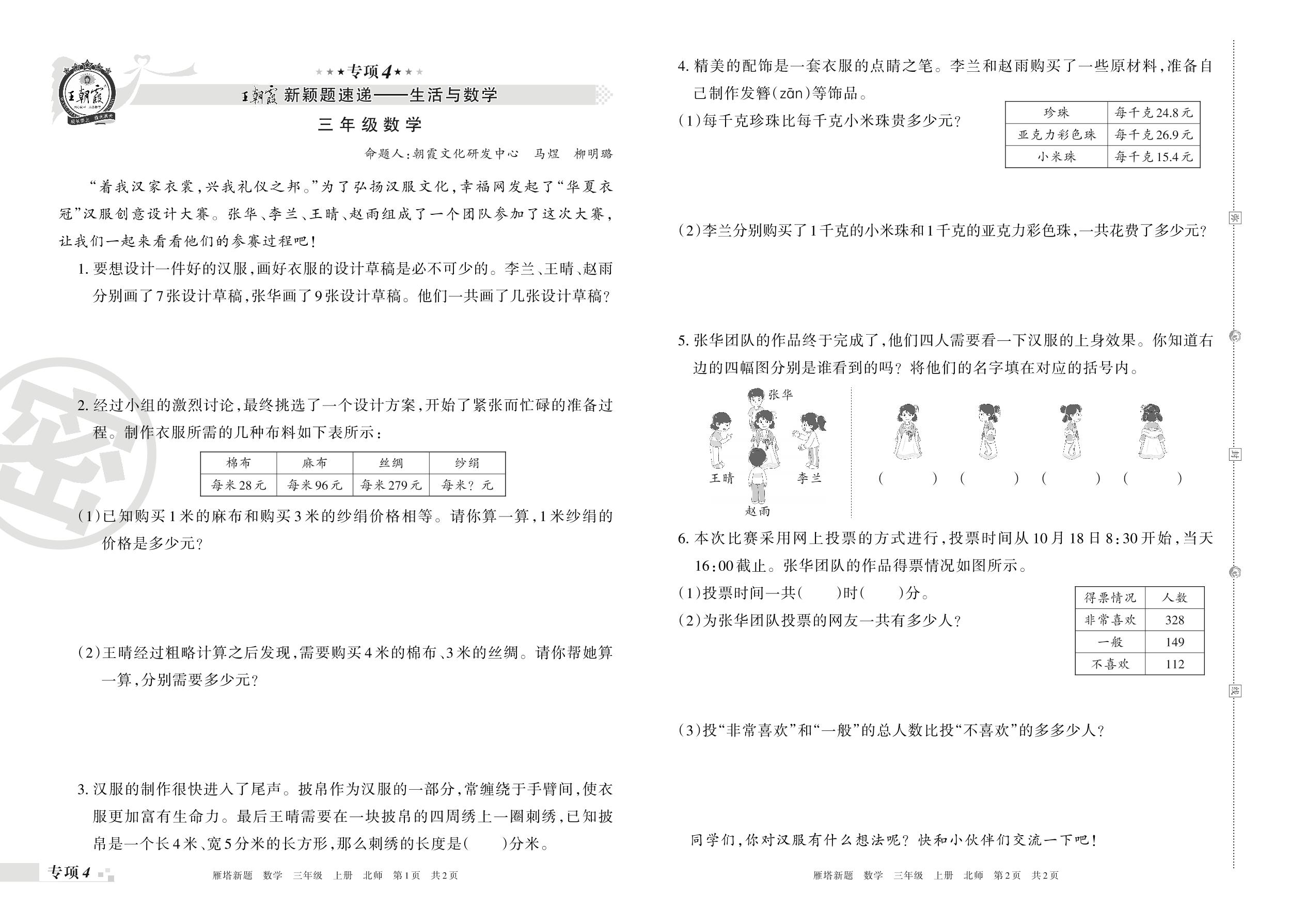王朝霞期末专项卷——新颖题速递:生活与数学三年级上册数学(北师版)【4】