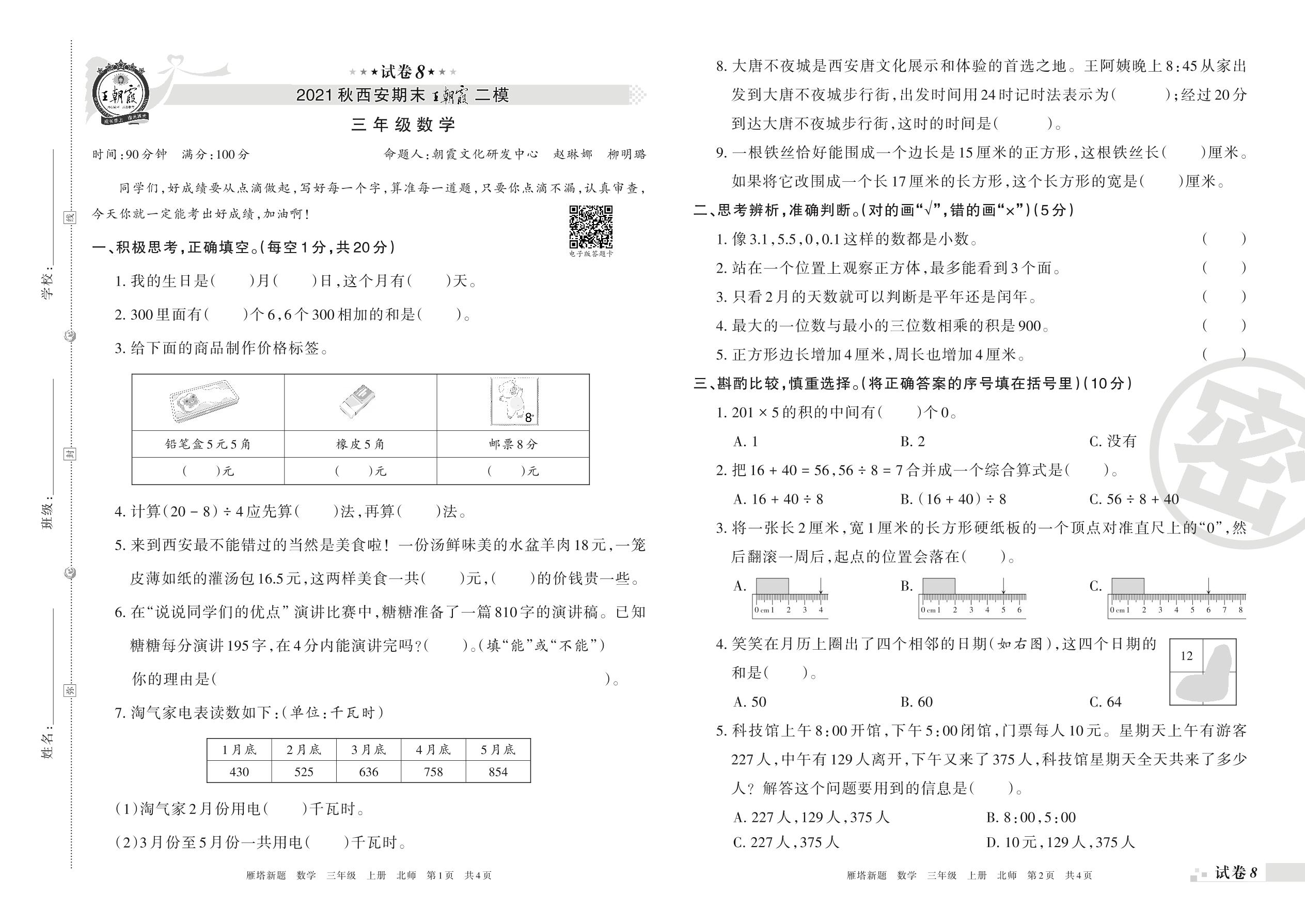 王朝霞期末模拟卷三年级上册数学(北师版)【8】