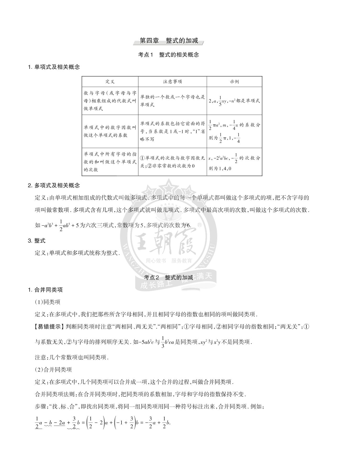 王朝霞期末知识梳理——第四章 整式的加减七年级上册数学(冀教版)【4】