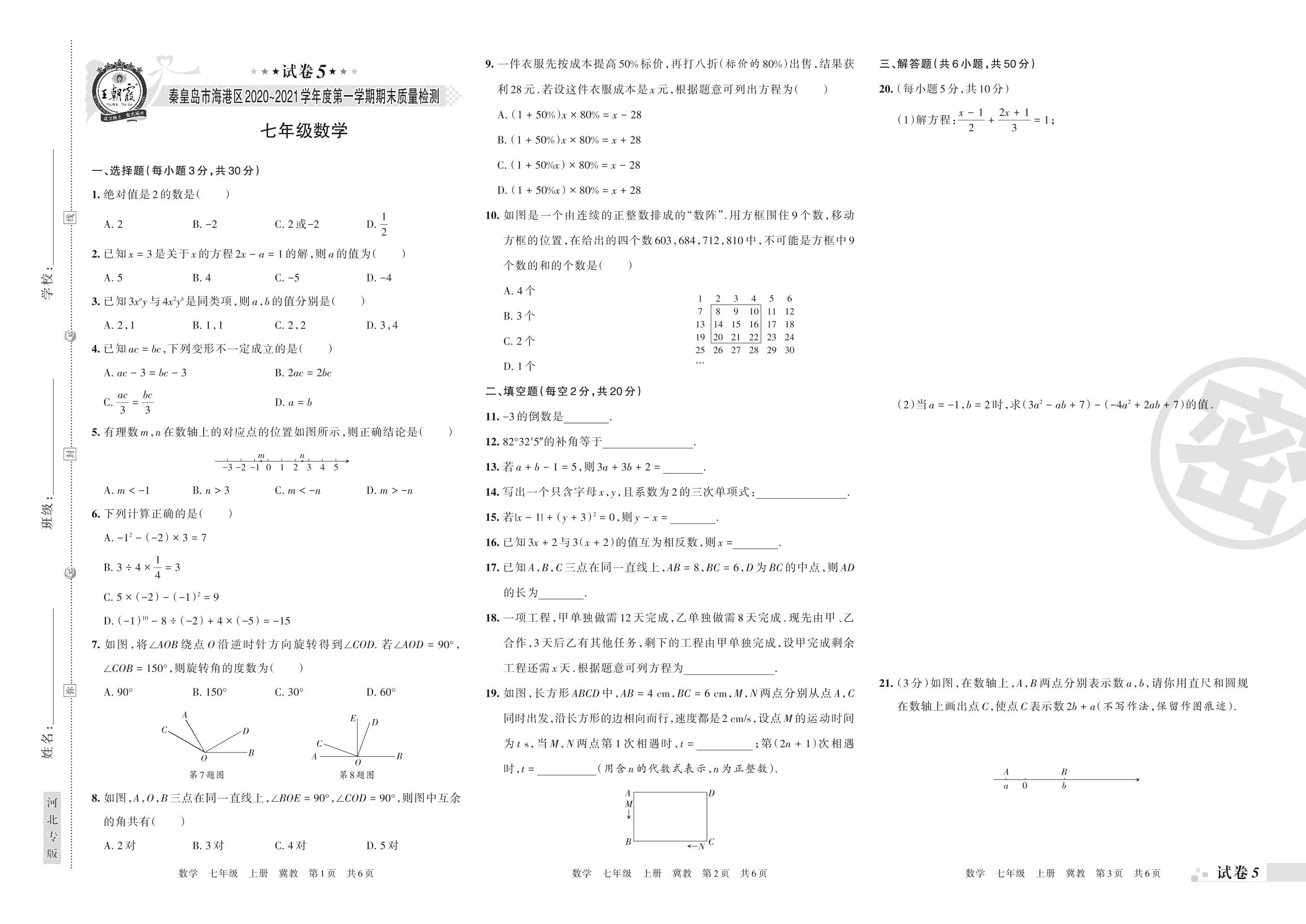 秦皇岛市海港区2020~2021学年度第一学期期末质量检测七年级数学(冀教版)【5】