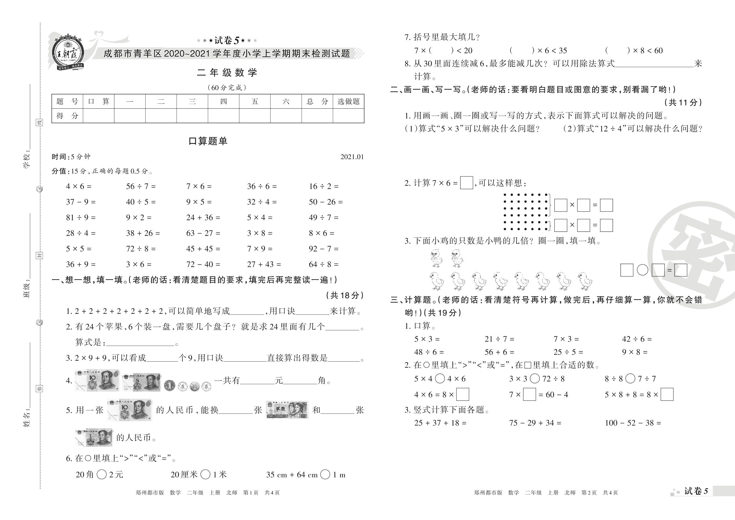 成都市青羊区2020~2021学年度小学上学期期末检测试题二年级数学(北师版)【5】