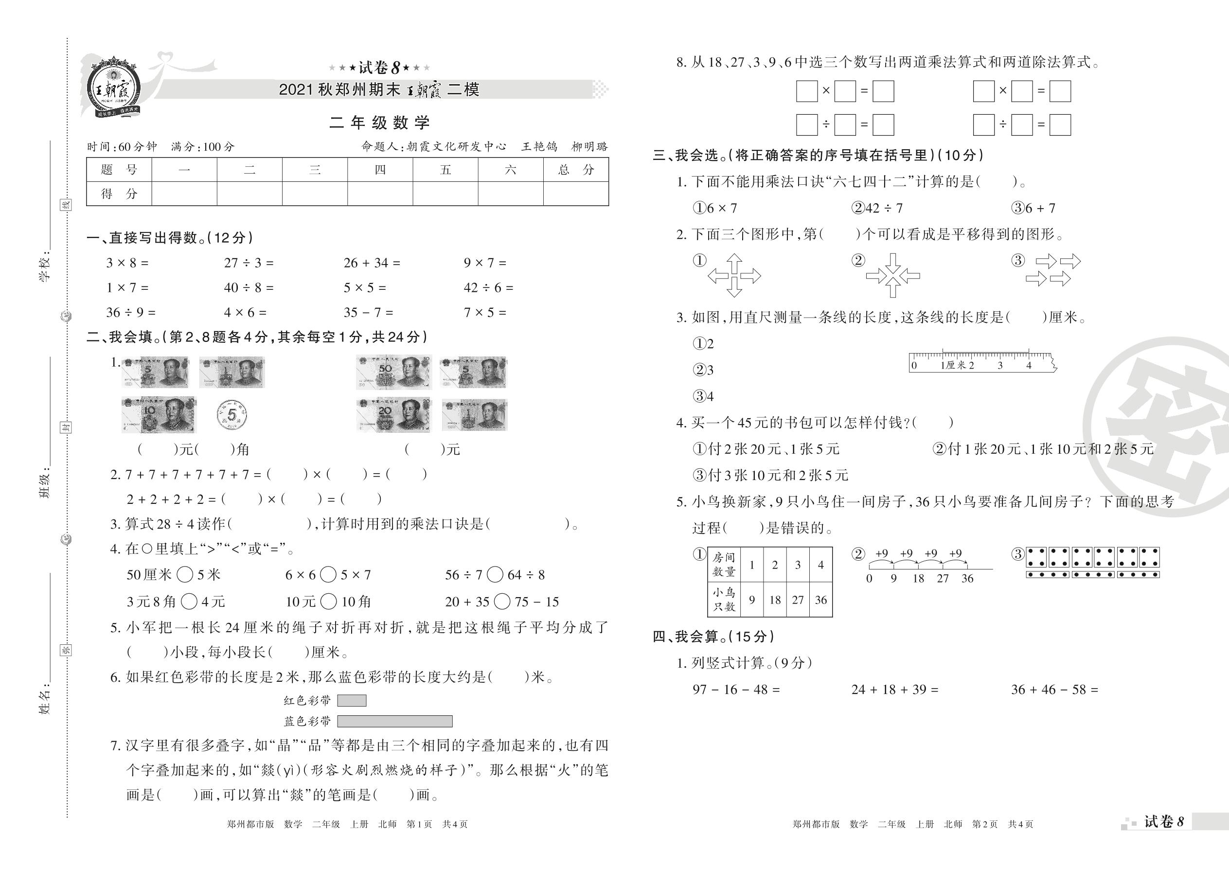 王朝霞期末模拟卷二年级上册数学(北师版)_R211223100123949【8】