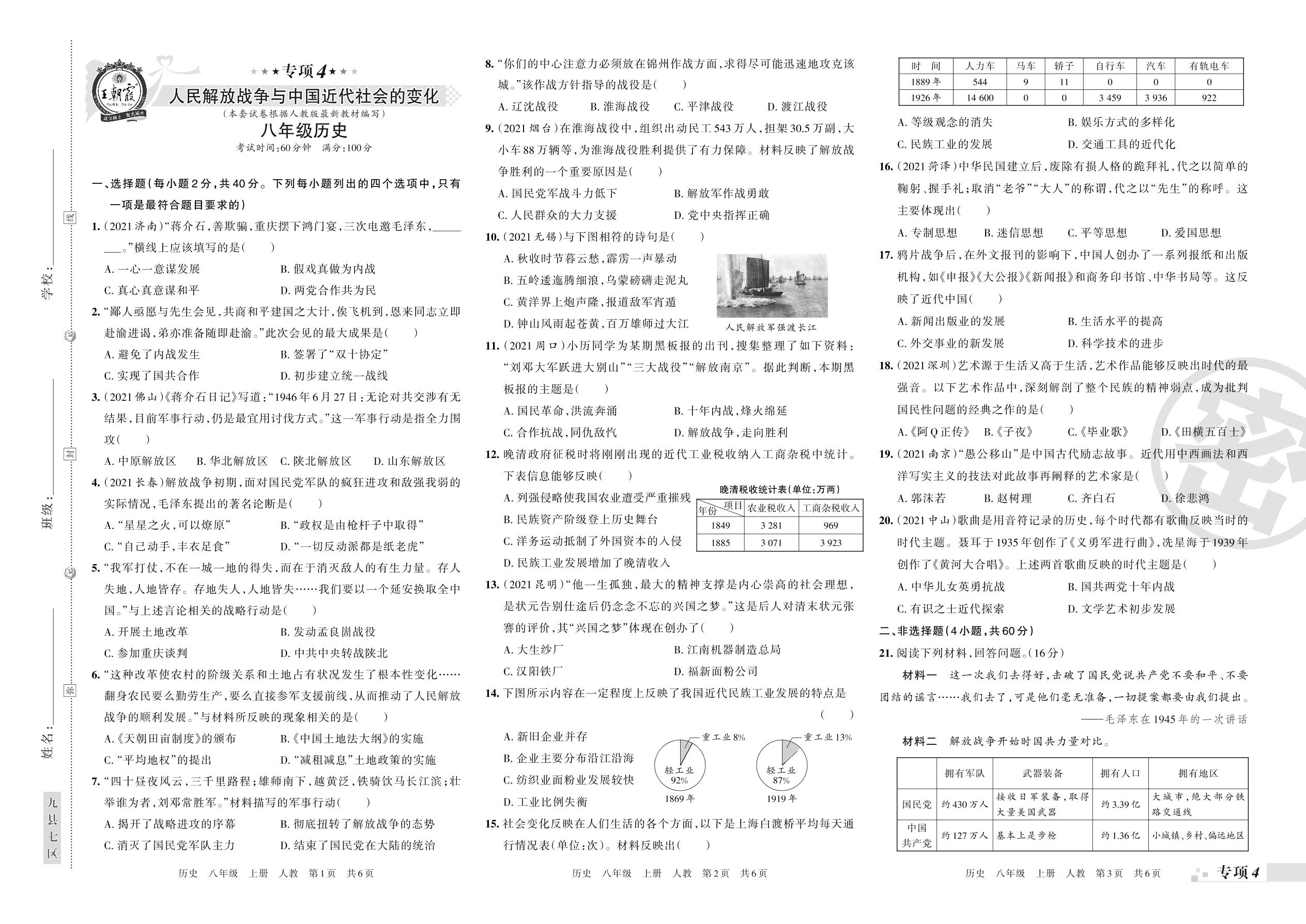 王朝霞期末专项卷——人民解放战争与中国近代社会的变化八年级上册历史(人教版)【4】