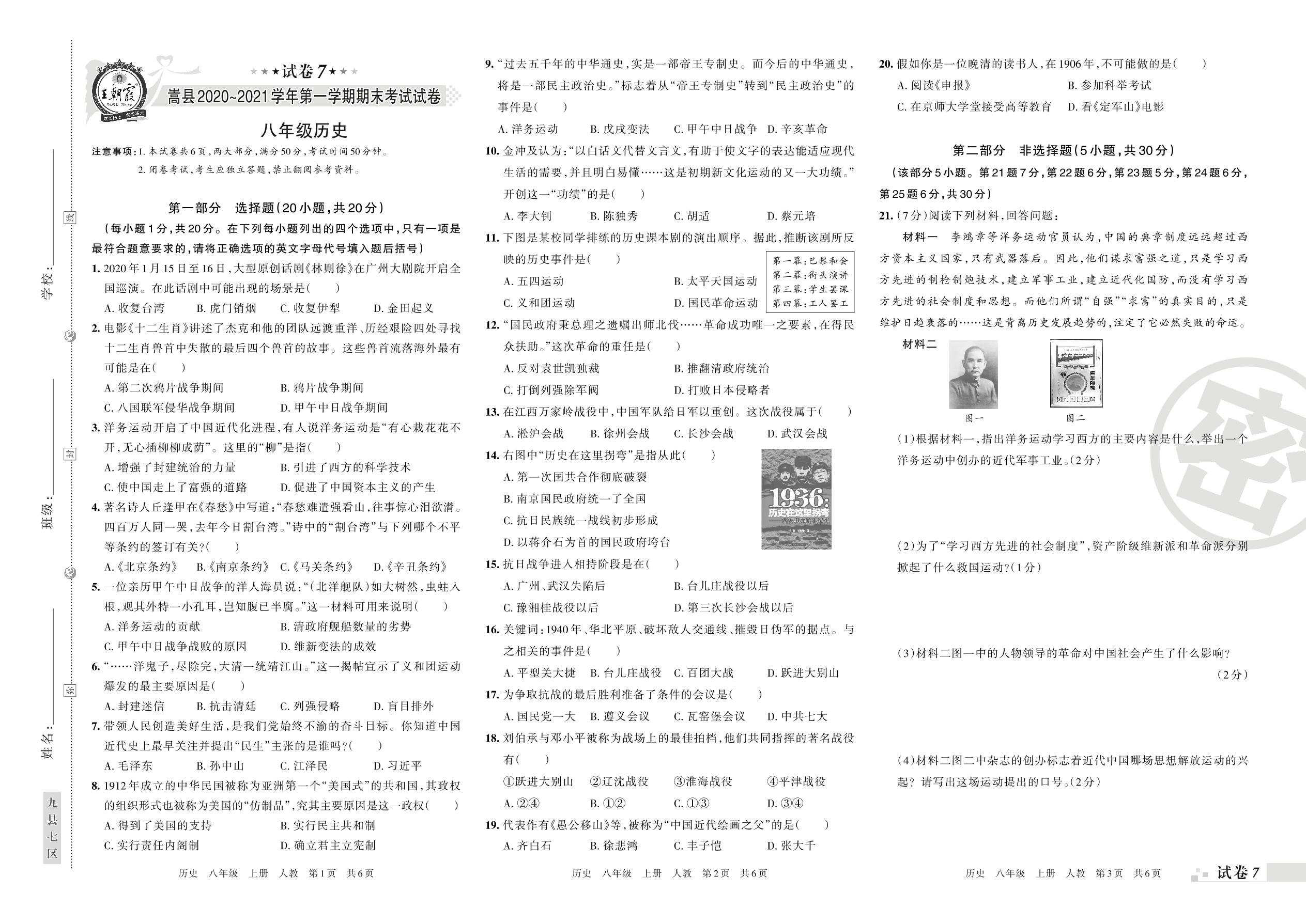 嵩县2020~2021学年第一学期期末考试试卷八年级历史(人教版)【7】