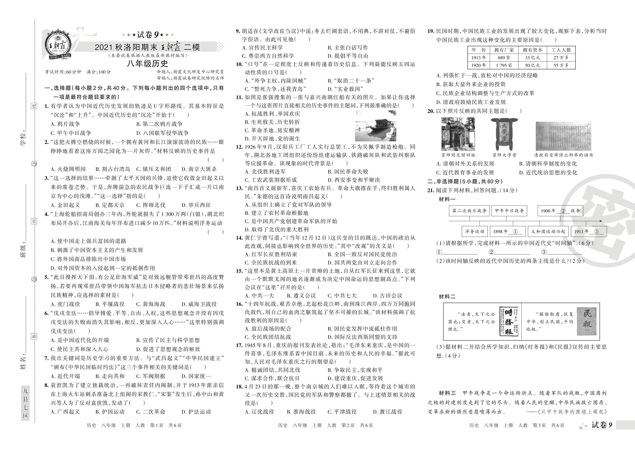 王朝霞期末模拟卷八年级上册历史(人教版)_R211223100238827【9】