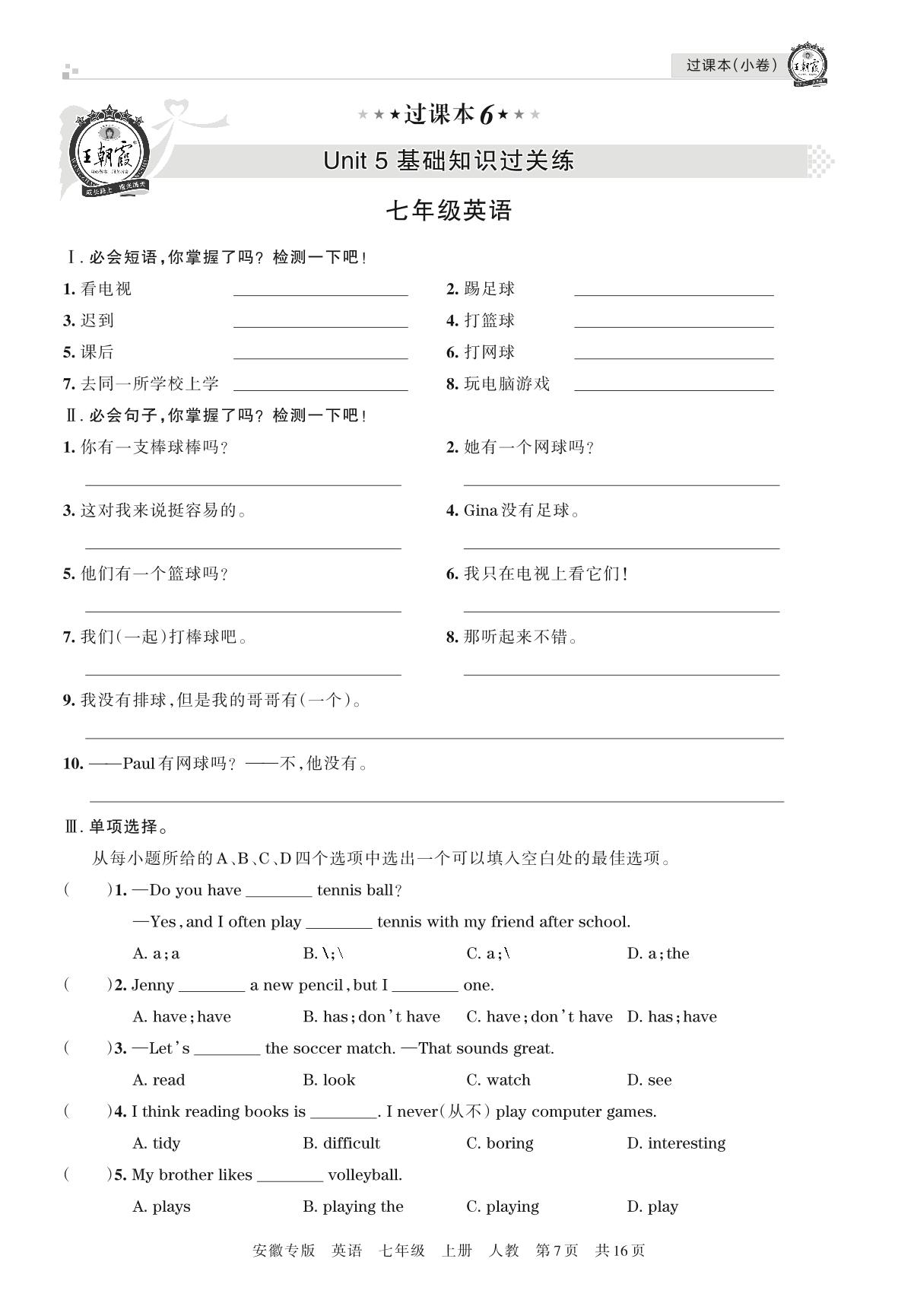 王朝霞期末过课本——Unit 5基础知识过关练七年级上册英语(人教版)【6】
