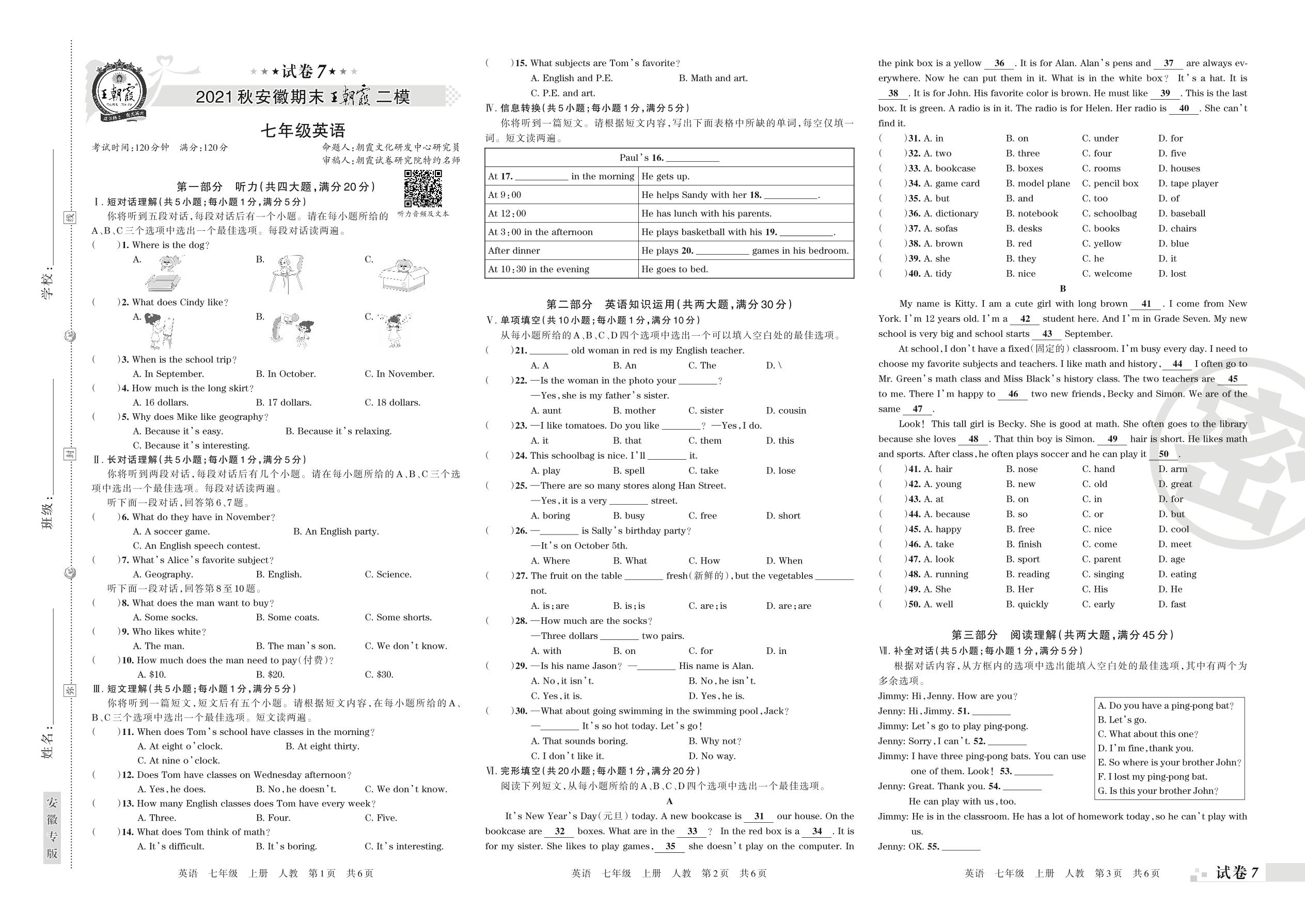 王朝霞期末模拟卷七年级上册英语(人教版)【7】