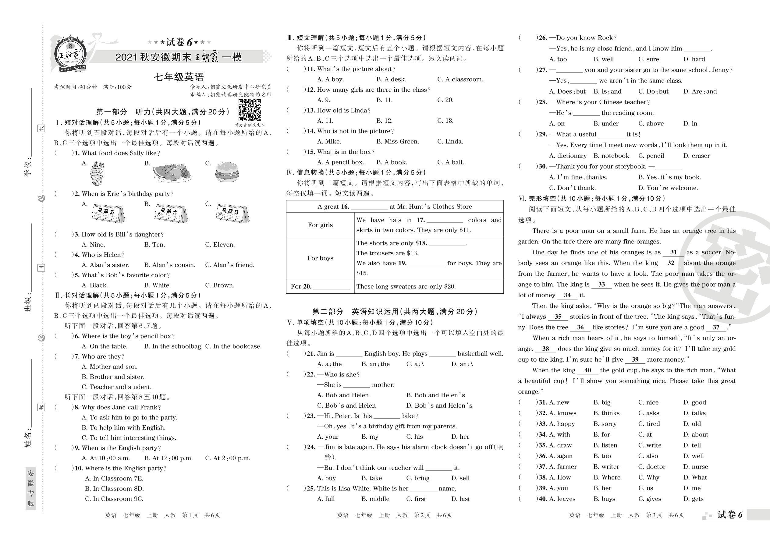 王朝霞期末模拟卷七年级上册英语(人教版)【6】