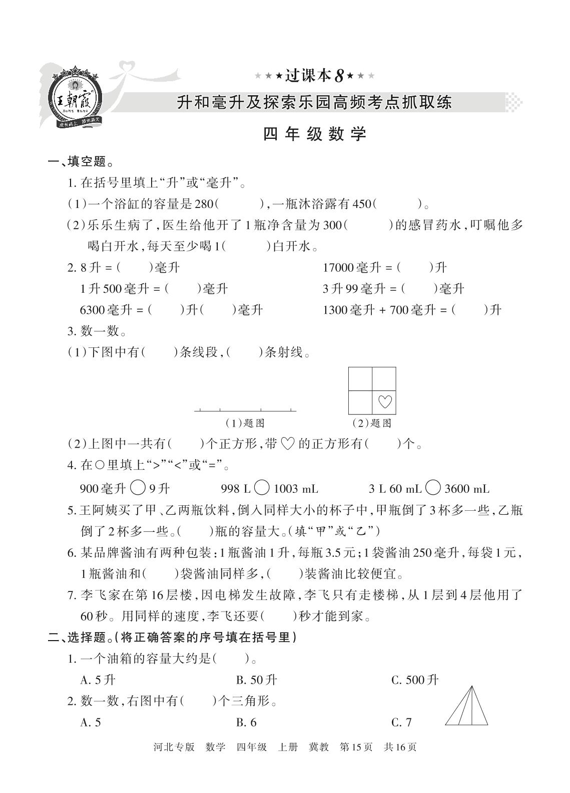 王朝霞期末过课本——升和毫升及探索乐园高频考点抓取练四年级上册数学(冀教版)【8】