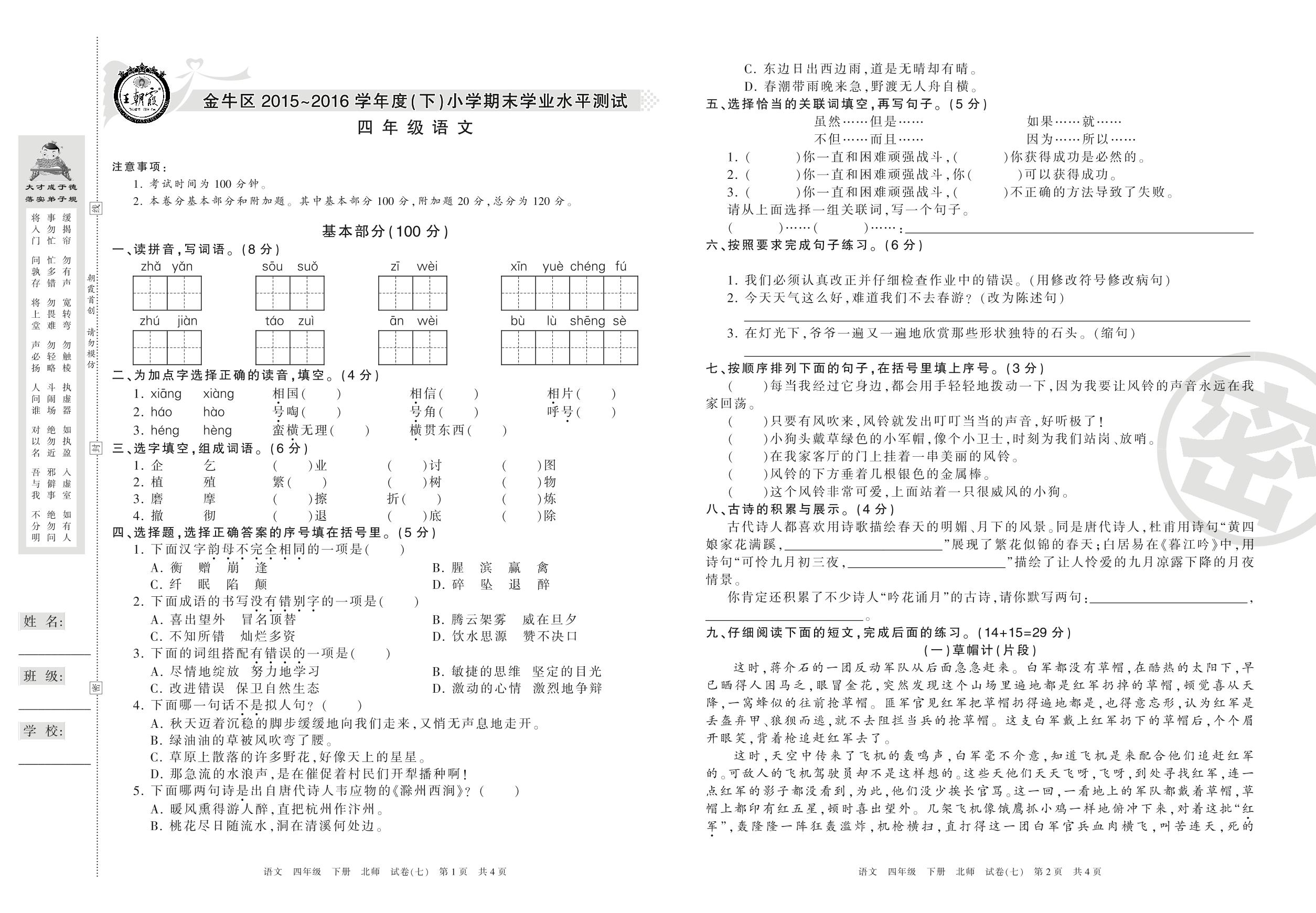 2015-2016学年第二学期成都市金牛区四年级语文试卷(北师版)【7】