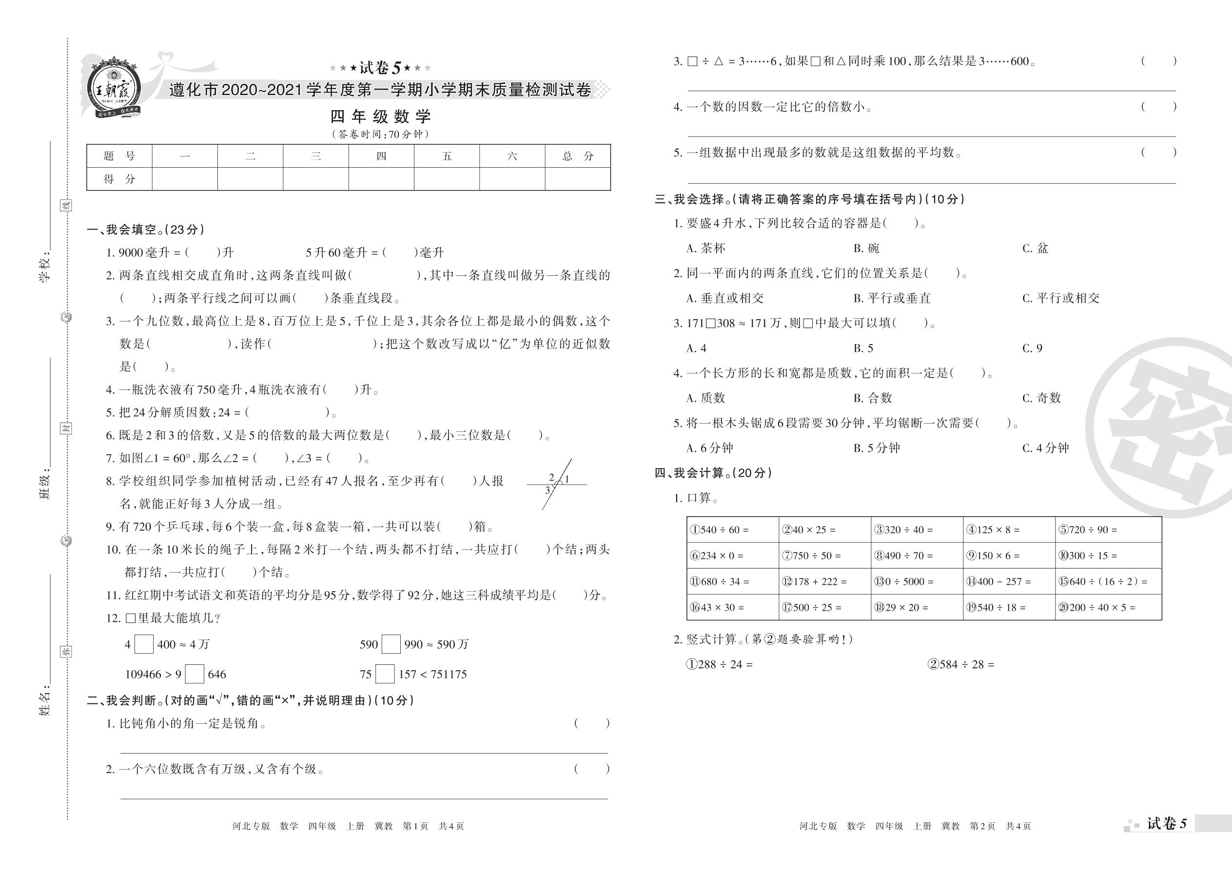遵化市2020~2021学年度第一学期小学期末质量检测试卷四年级数学(冀教版)【5】
