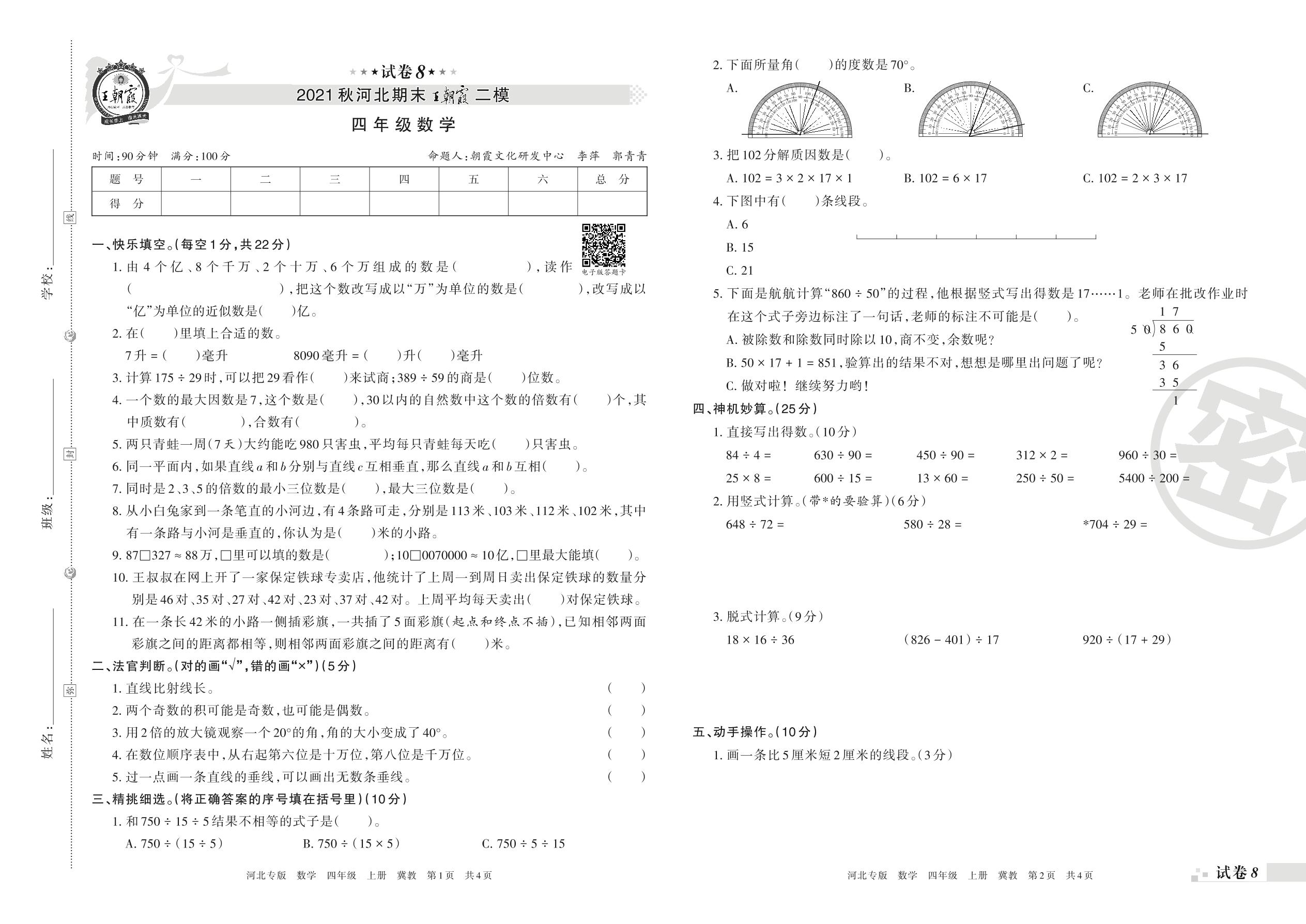 王朝霞期末模拟卷四年级上册数学(冀教版)【8】