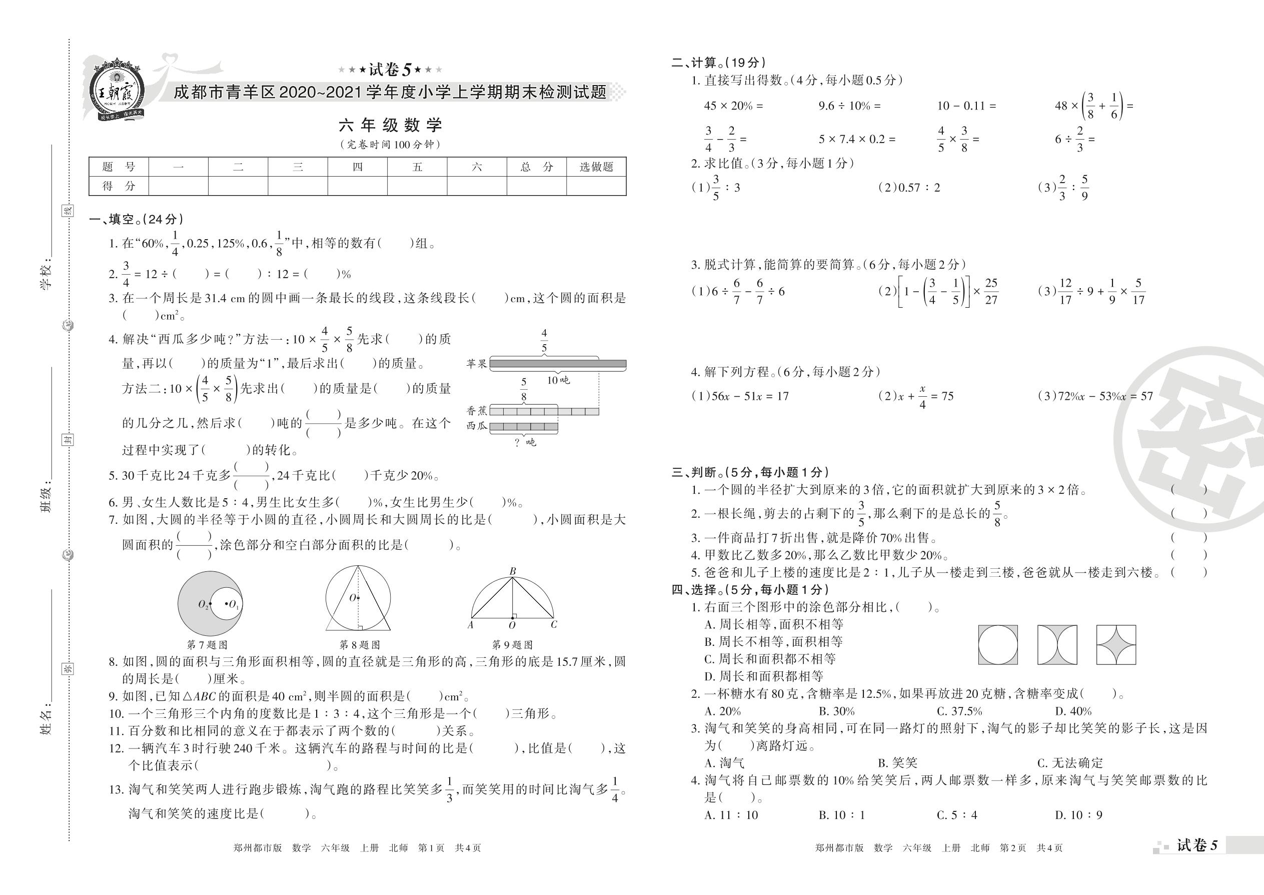 成都市青羊区2020~2021学年度小学上学期期末检测试题六年级数学(北师版)【5】