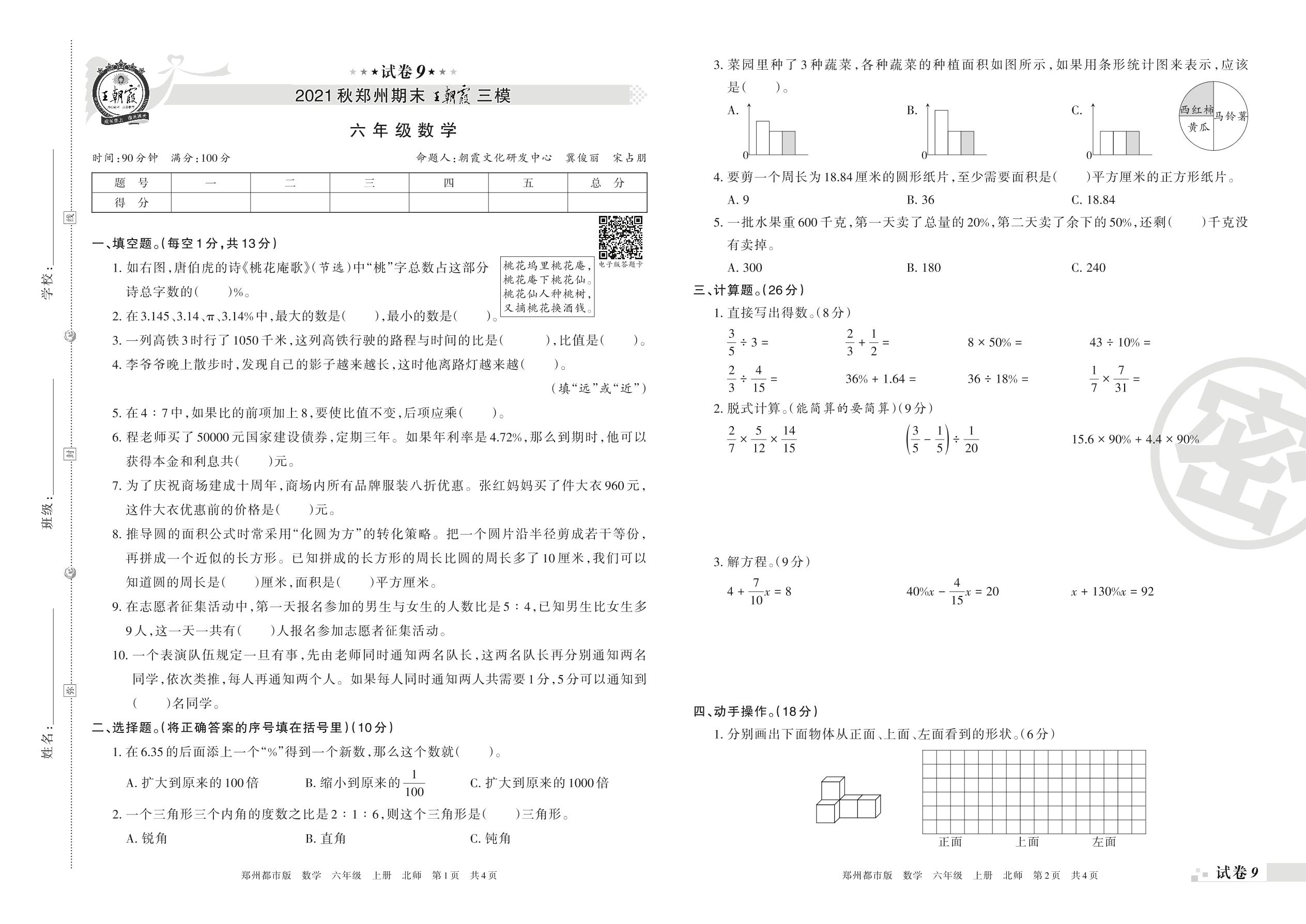 王朝霞期末模拟卷六年级上册数学(北师版)_R211223100735909【9】