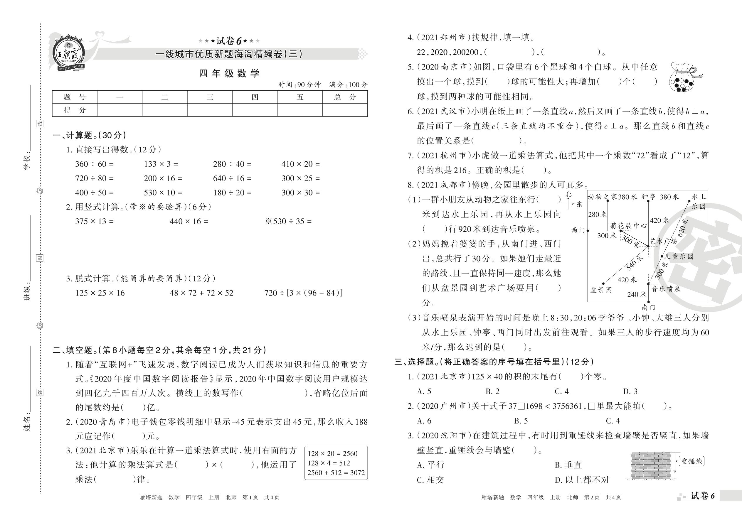 一线城市优质新题海淘精编卷(三)四年级上册数学(北师版)【6】