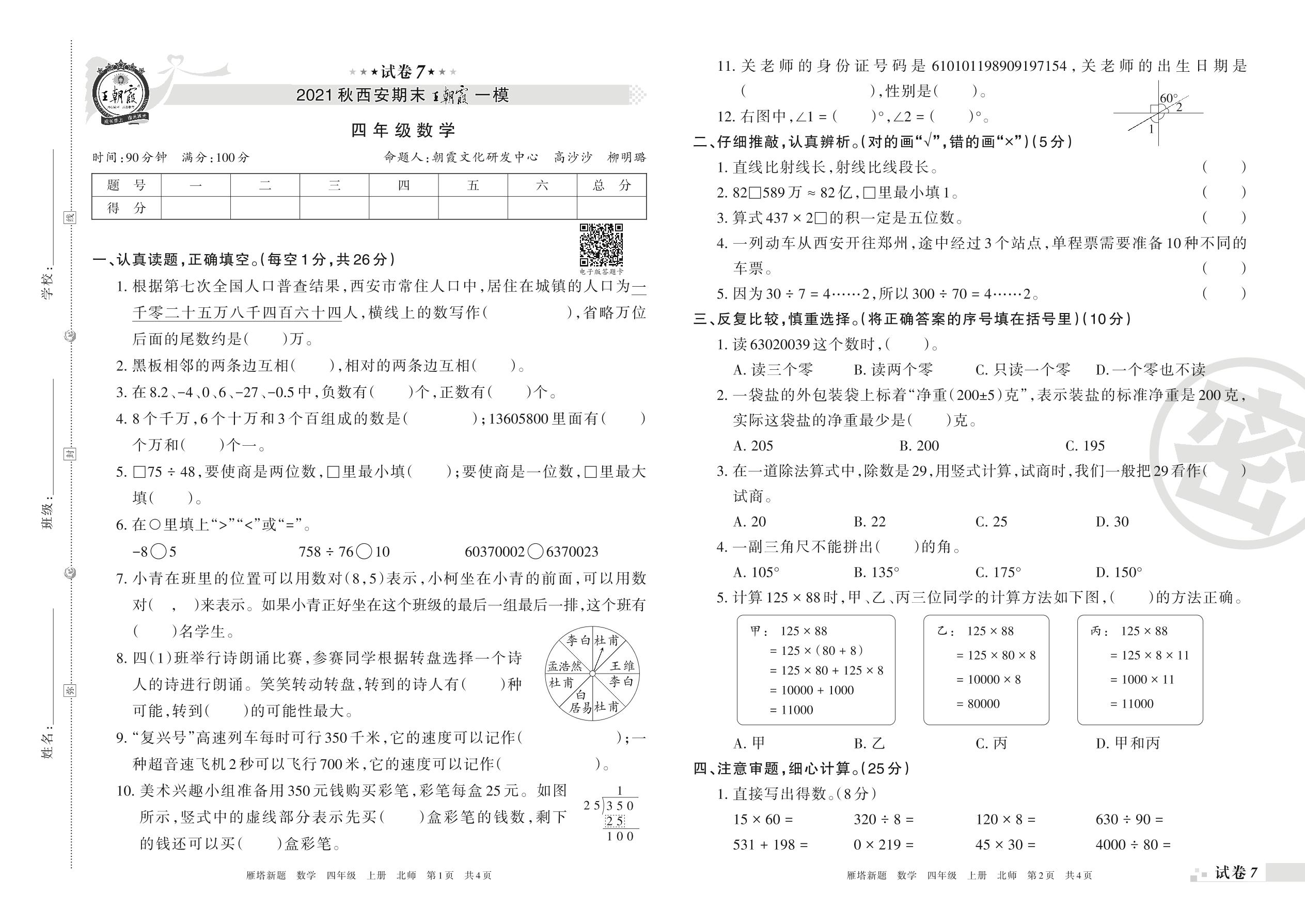 王朝霞期末模拟卷四年级上册数学(北师版)【7】
