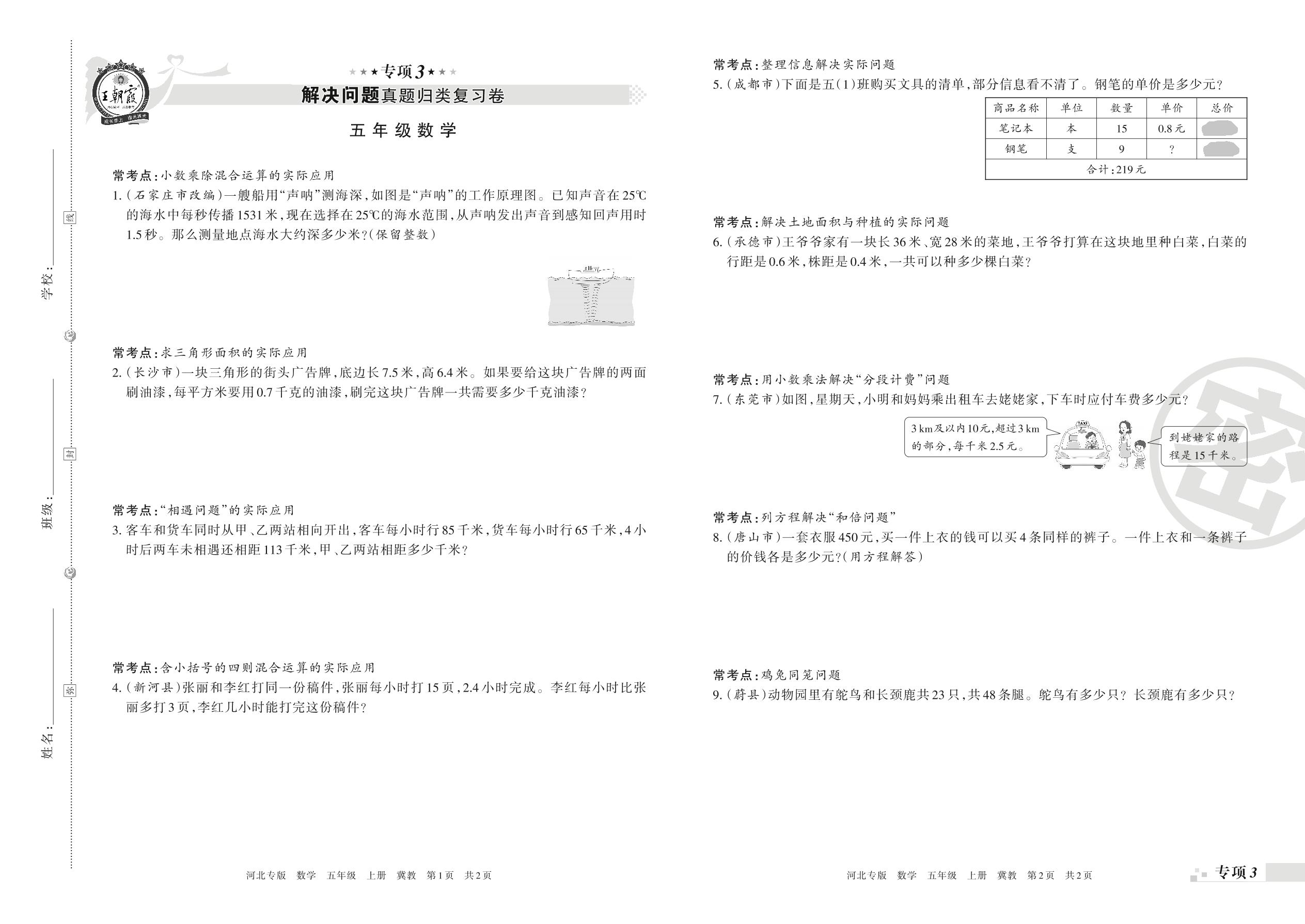 王朝霞期末专项卷——解决问题真题归类复习卷五年级上册数学(冀教版)【3】