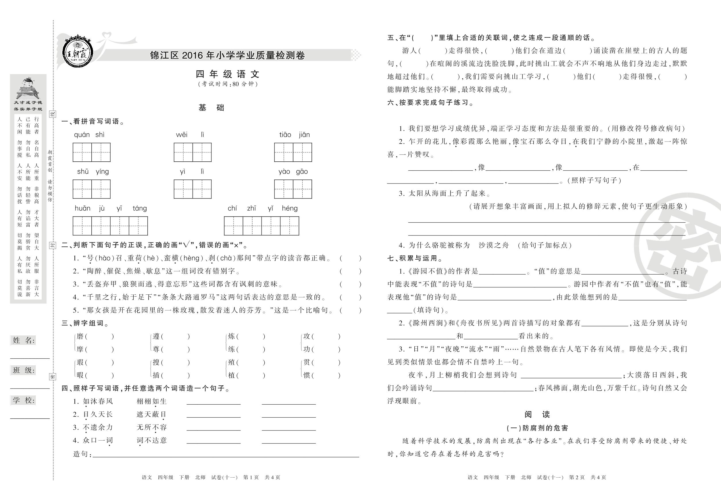 2015-2016学年第二学期成都市锦江区四年级语文试卷(北师版)【11】