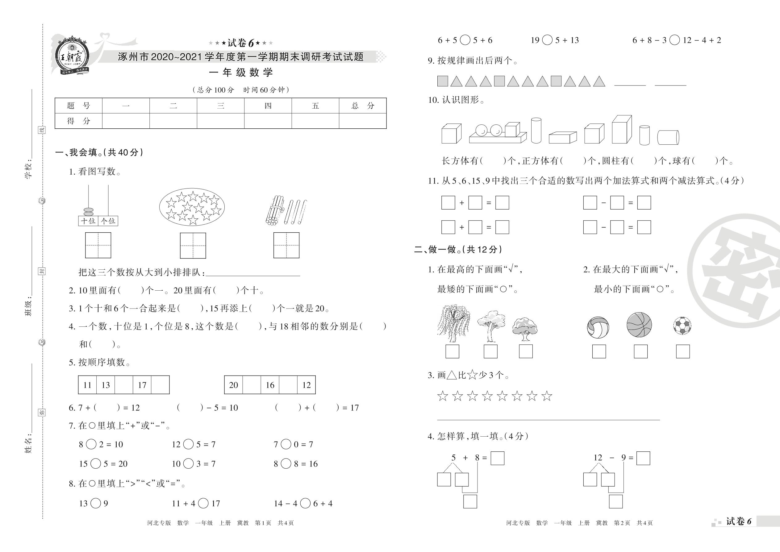涿州市2020~2021学年度第一学期期末调研考试试题一年级数学(冀教版)【6】