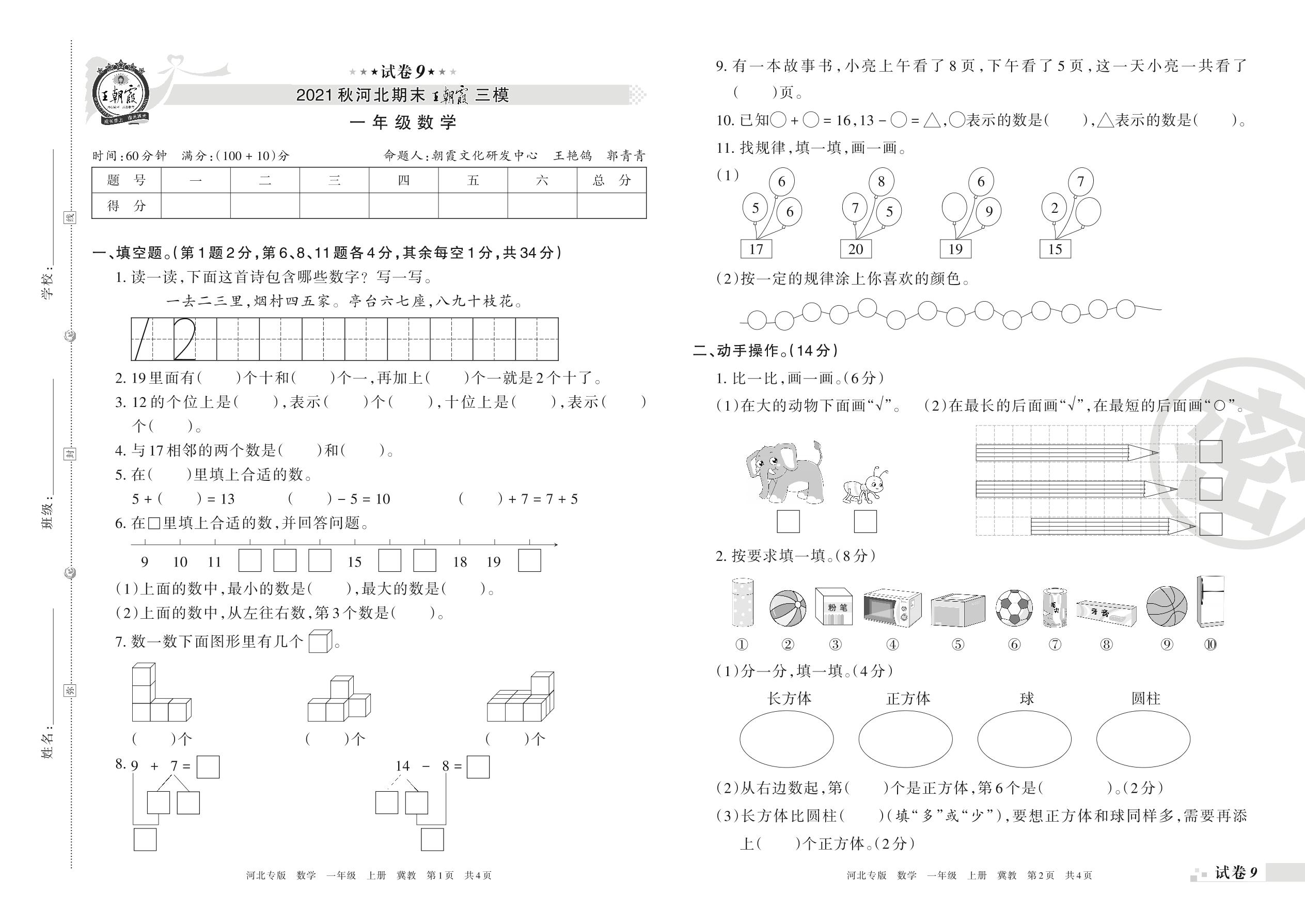 王朝霞期末模拟卷一年级上册数学(冀教版)【9】