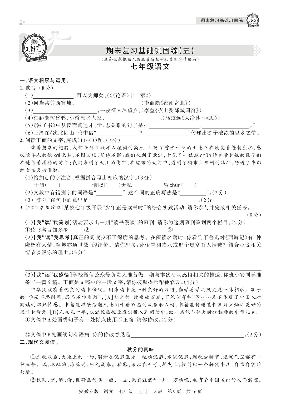 王朝霞期末小卷——期末复习基础巩固练(五)七年级上册语文(人教版)【5】