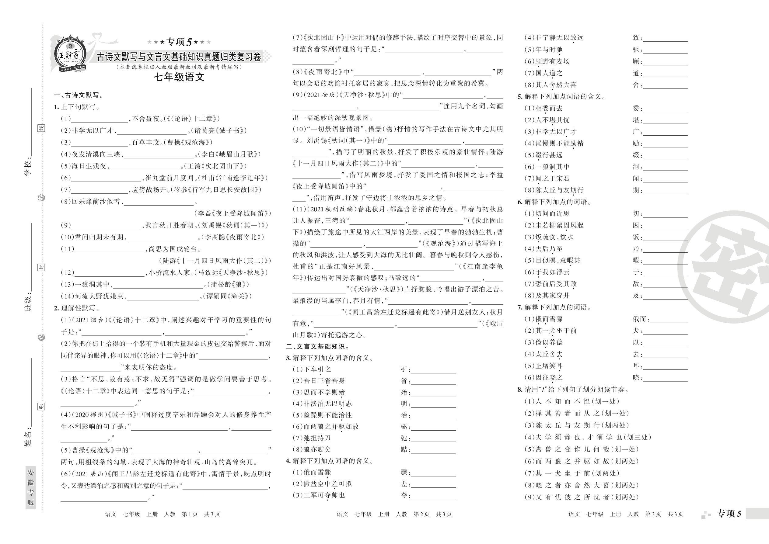 王朝霞期末专项卷——古诗文默写与文言文基础知识真题归类复习卷七年级上册语文(人教版)【5】