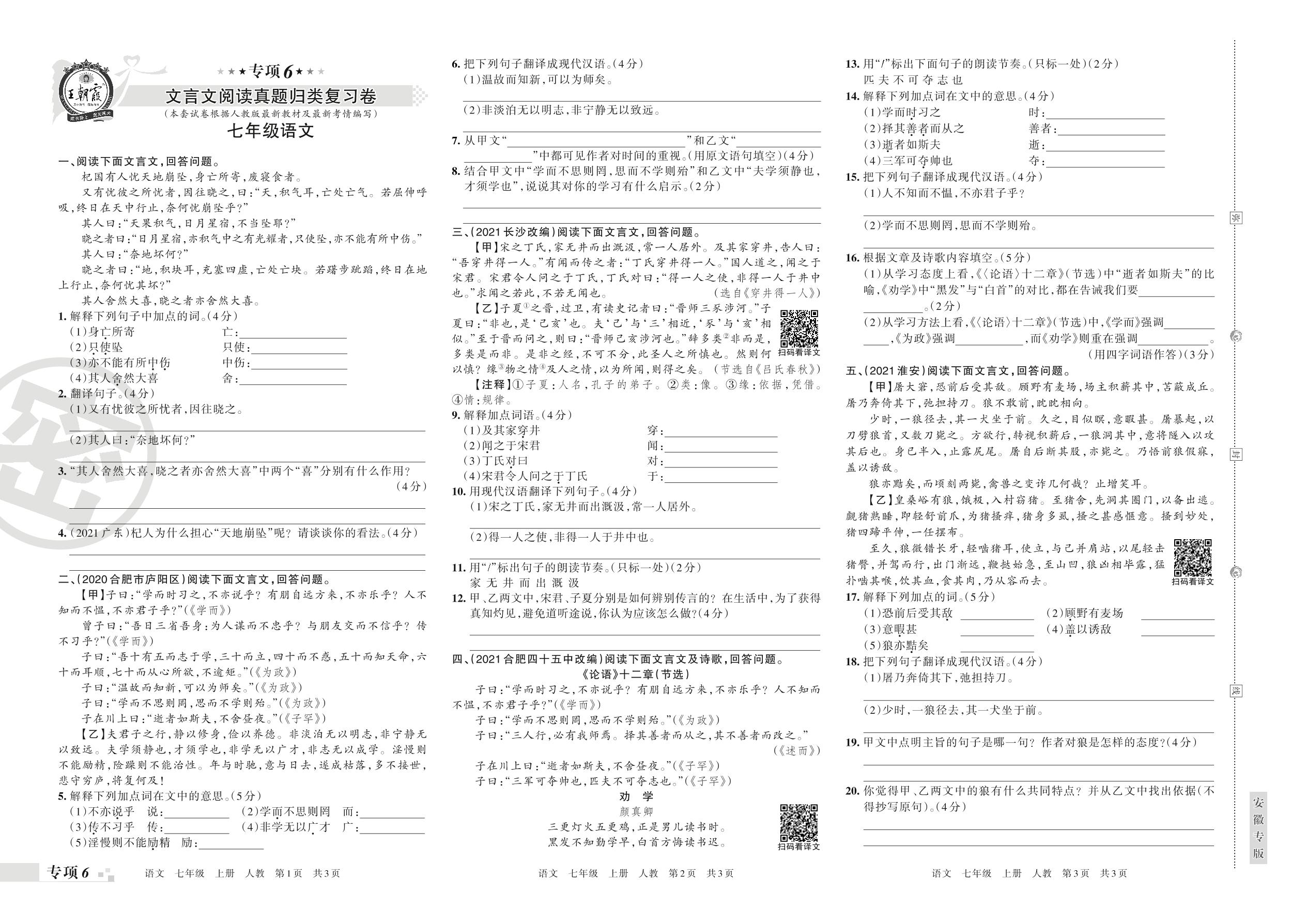 王朝霞期末专项卷——文言文阅读真题归类复习卷七年级上册语文(人教版)【6】