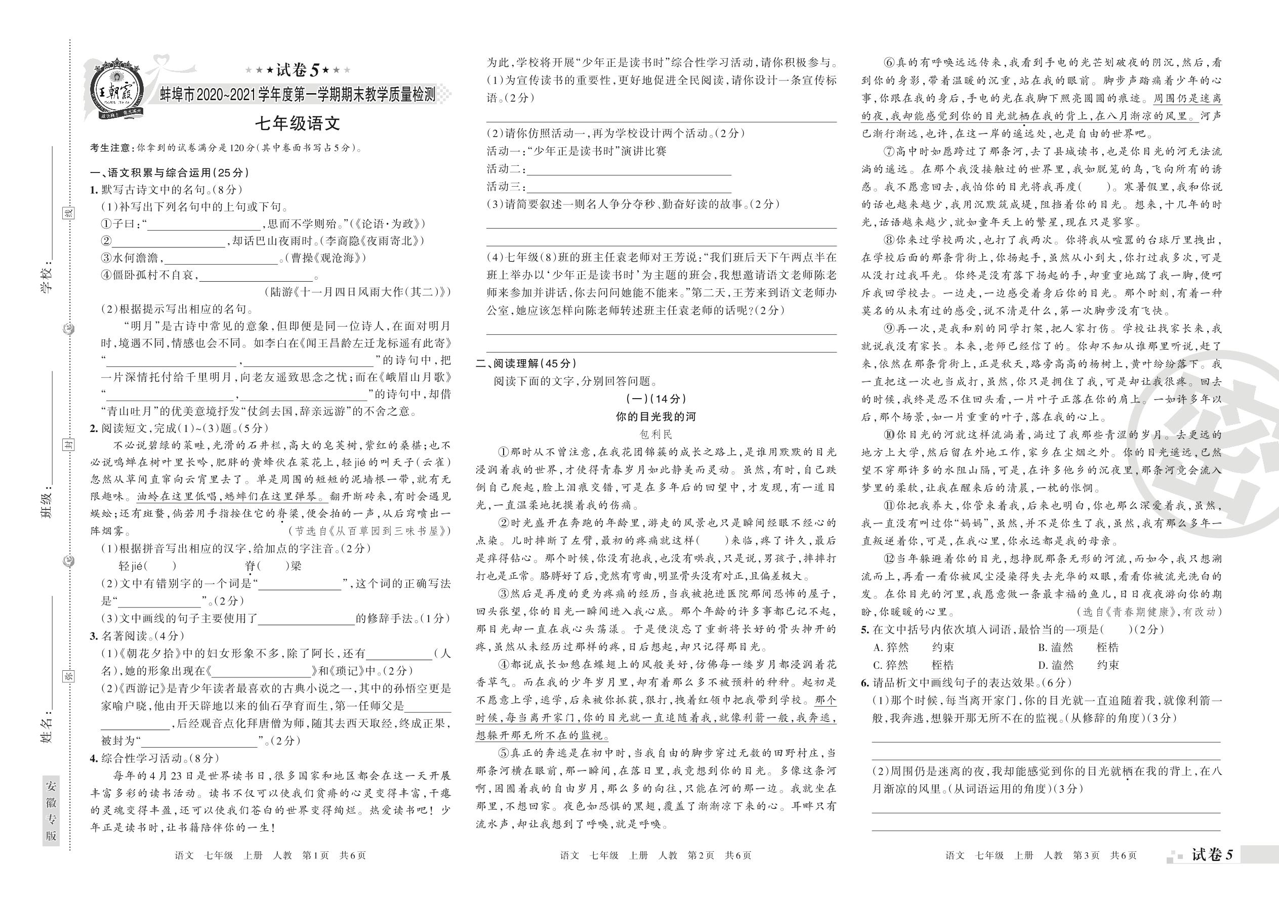 蚌埠市2020~2021学年度第一学期期末教学质量检测七年级语文(人教版)【5】
