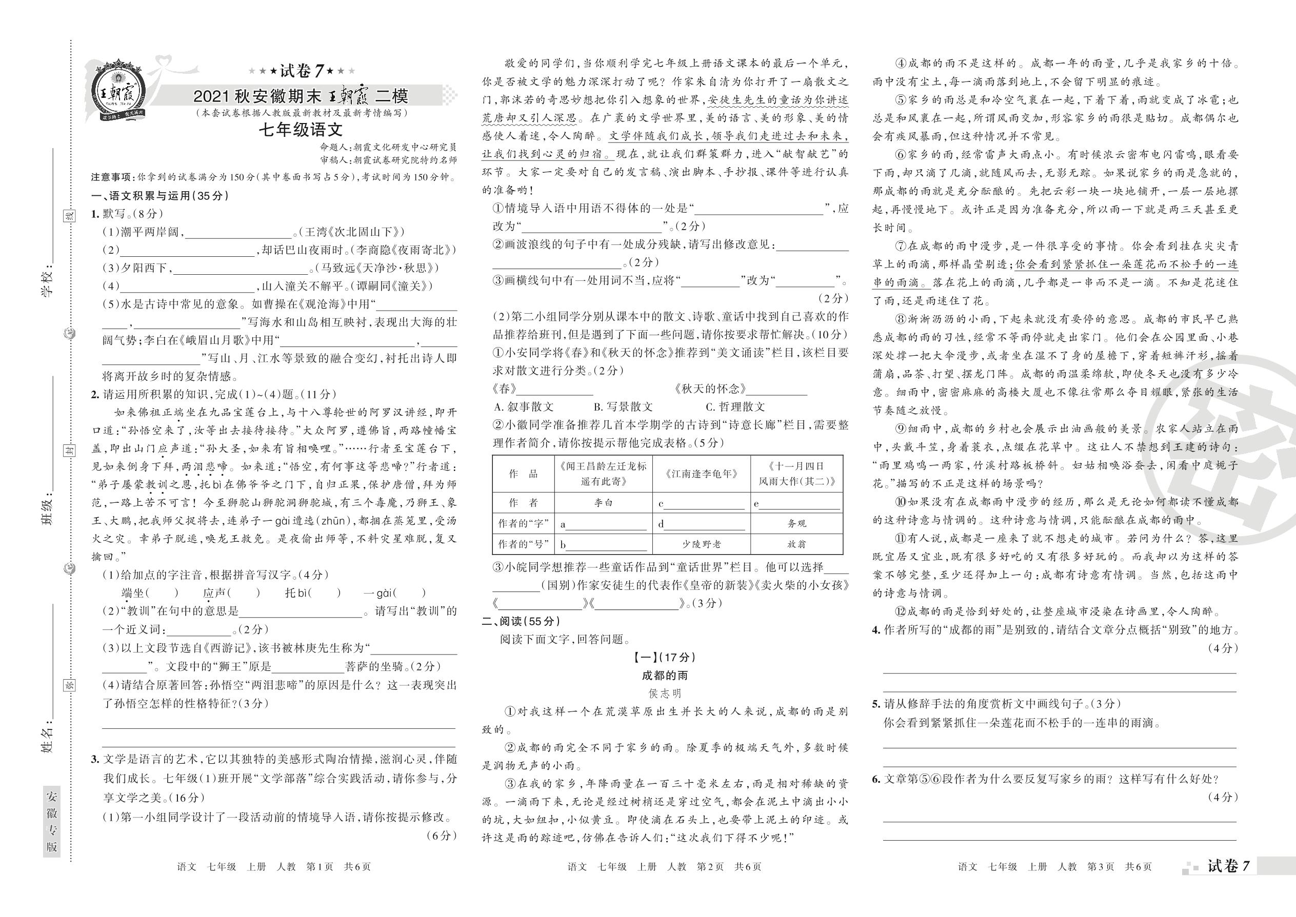 王朝霞期末模拟卷七年级上册语文(人教版)【7】