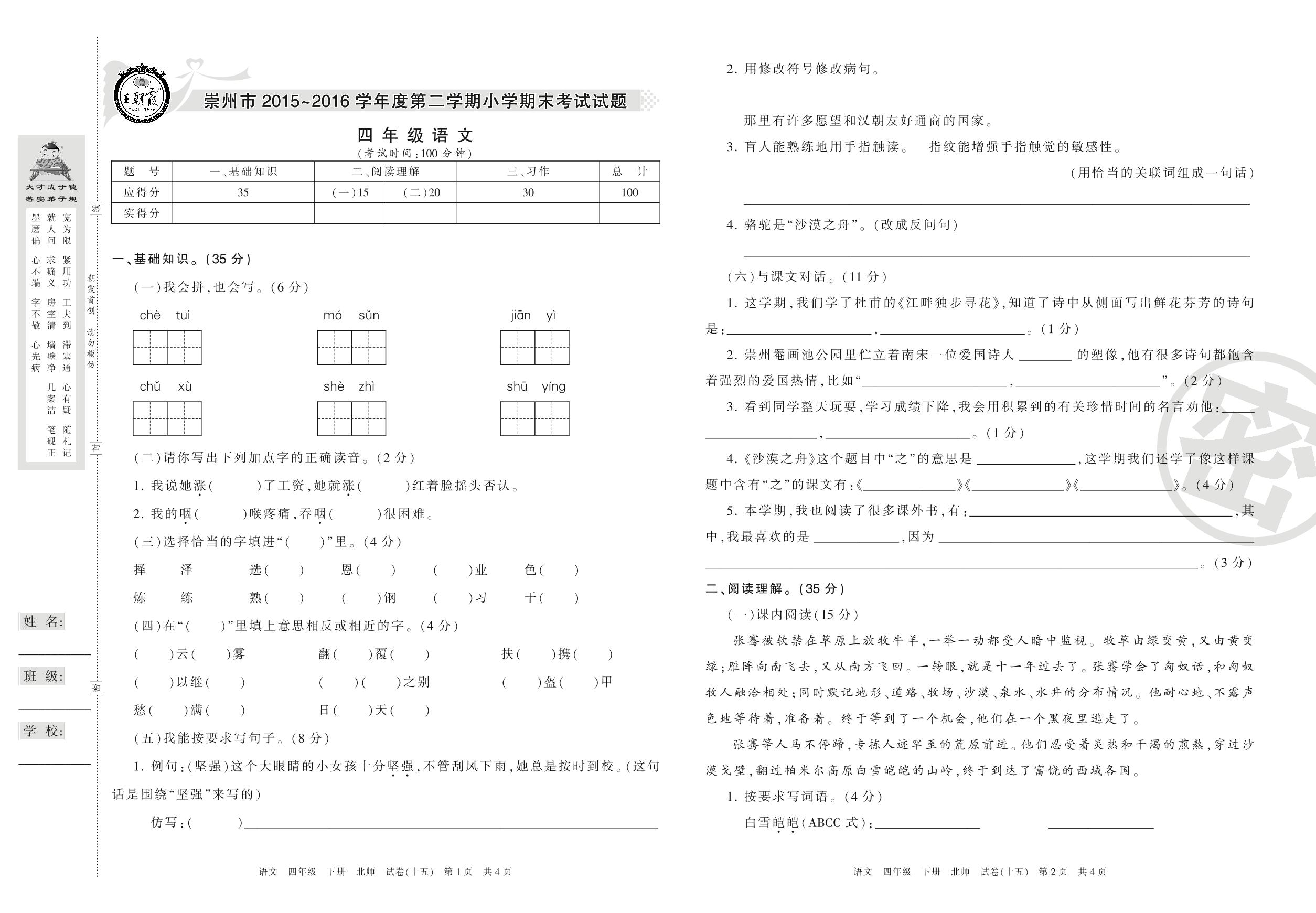 2015-2016学年第二学期崇州市四年级语文试卷(北师版)【15】