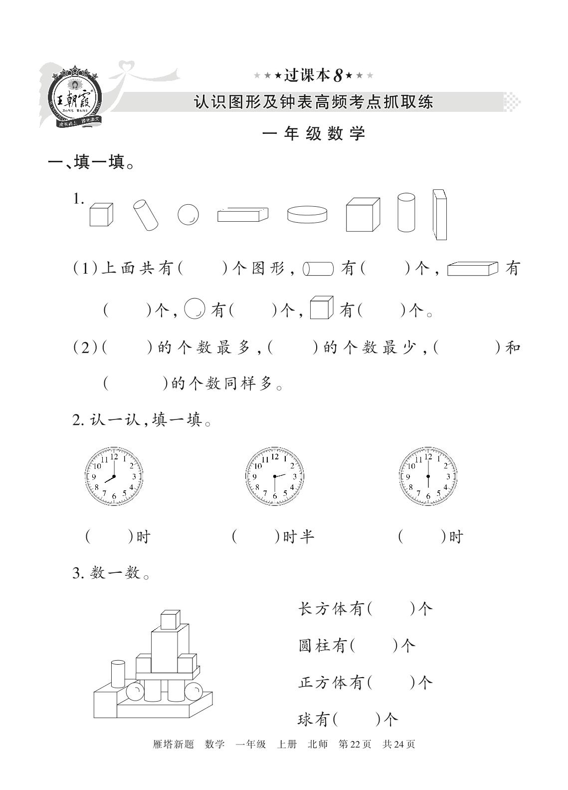 王朝霞期末过课本——认识图形及钟表高频考点抓取练一年级上册数学(北师版)【8】