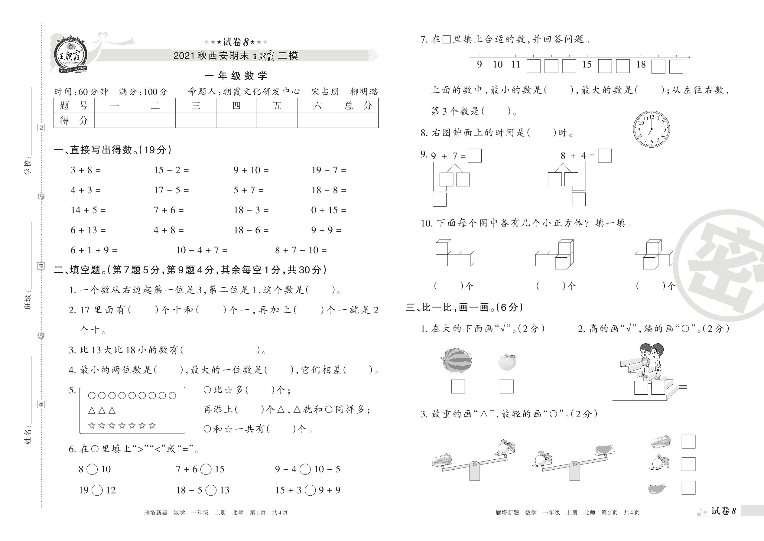 王朝霞期末模拟卷一年级上册数学(北师版)【8】