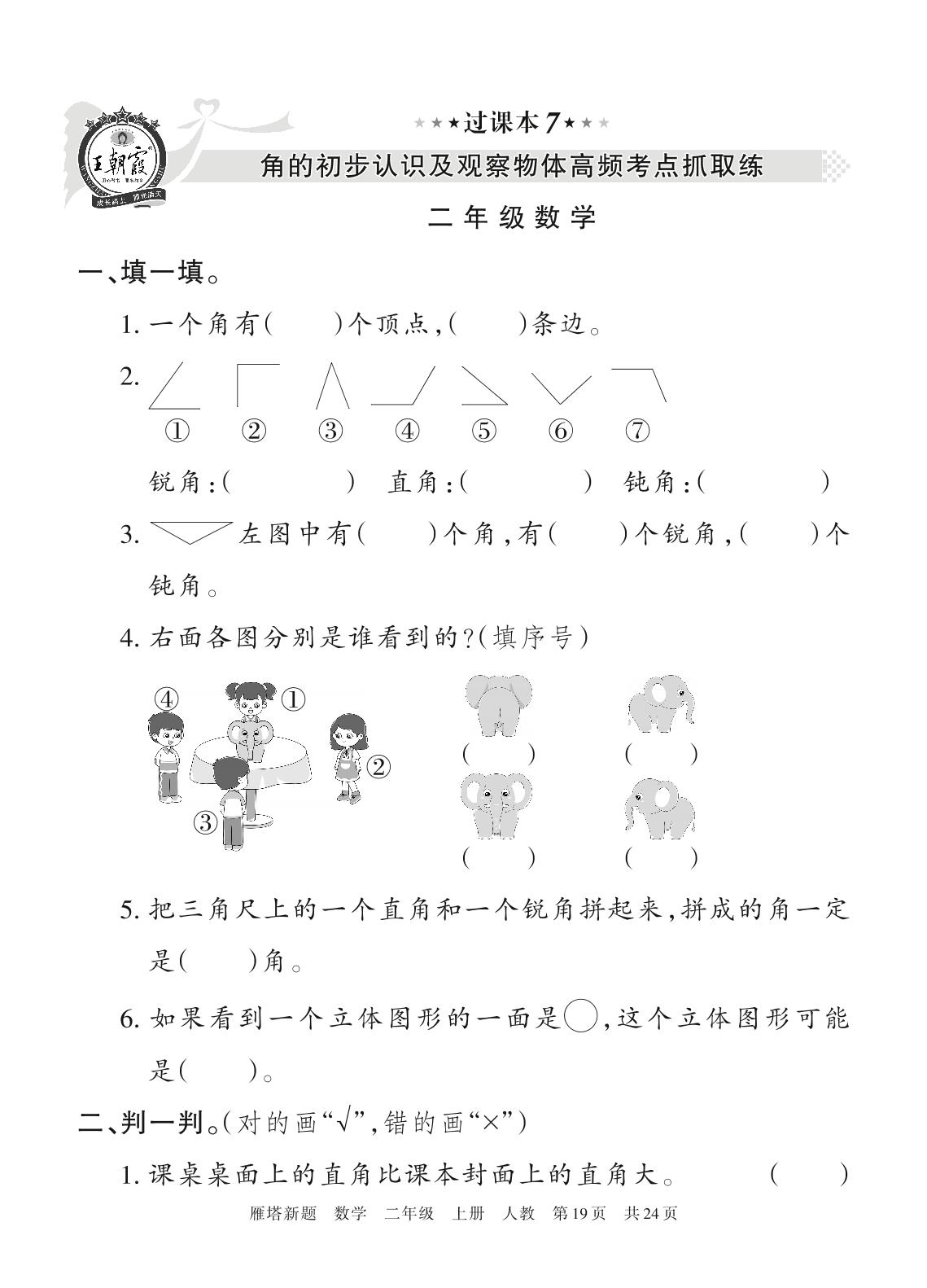 王朝霞期末过课本——角的初步认识及观察物体高频考点抓取练二年级上册数学(人教版)_R211223102549087【7】