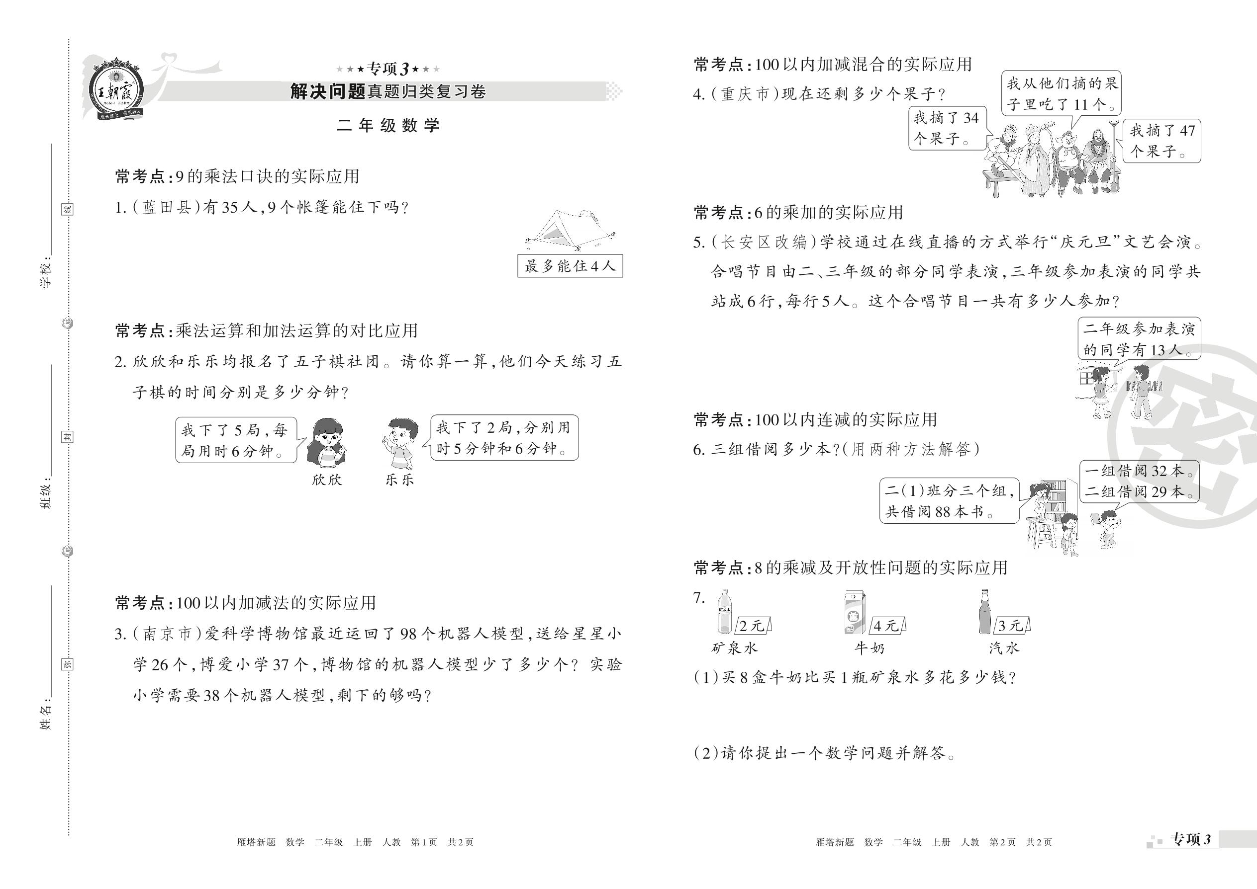 王朝霞期末专项卷——解决问题真题归类复习卷二年级上册数学(人教版)【3】