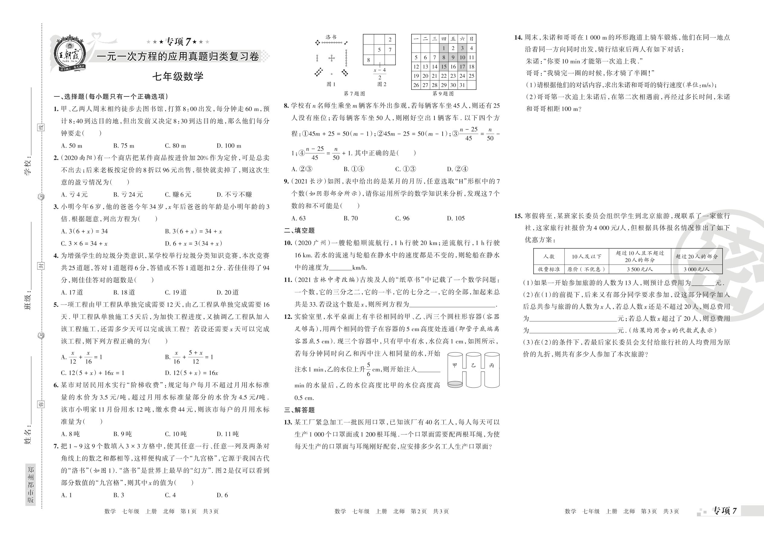 王朝霞期末专项卷——一元一次方程的应用真题归类复习卷七年级上册数学(北师版)【7】