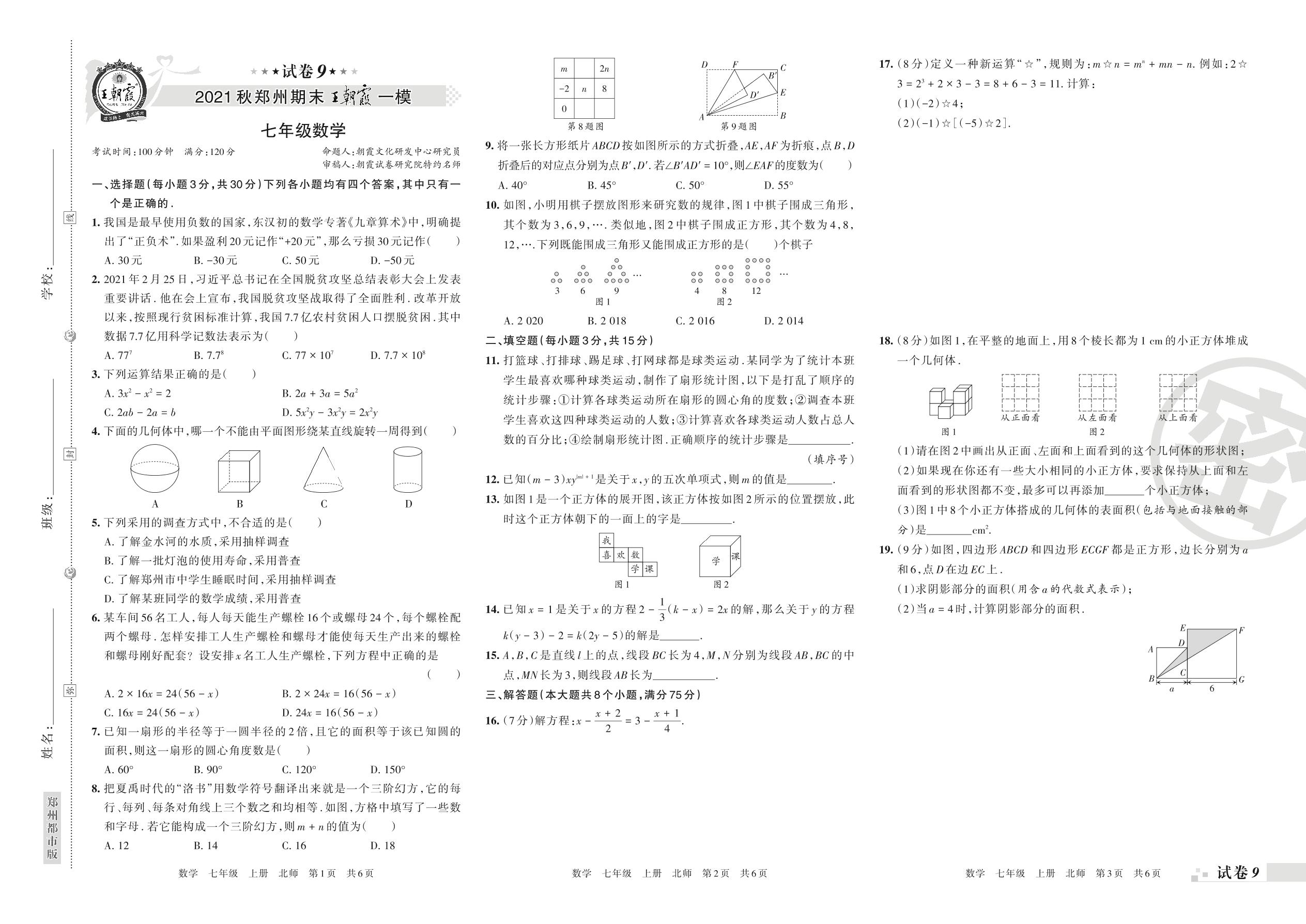 王朝霞期末模拟卷七年级上册数学(北师版)【9】