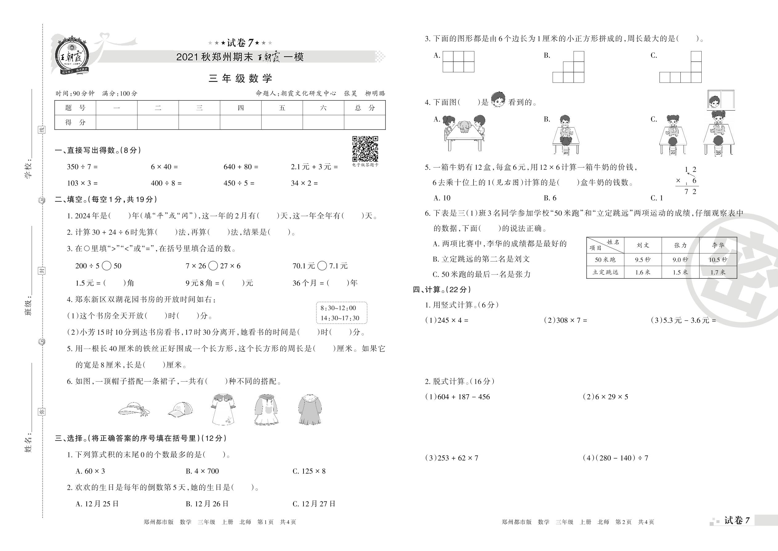 王朝霞期末模拟卷三年级上册数学(北师版)_R211223103806070【7】