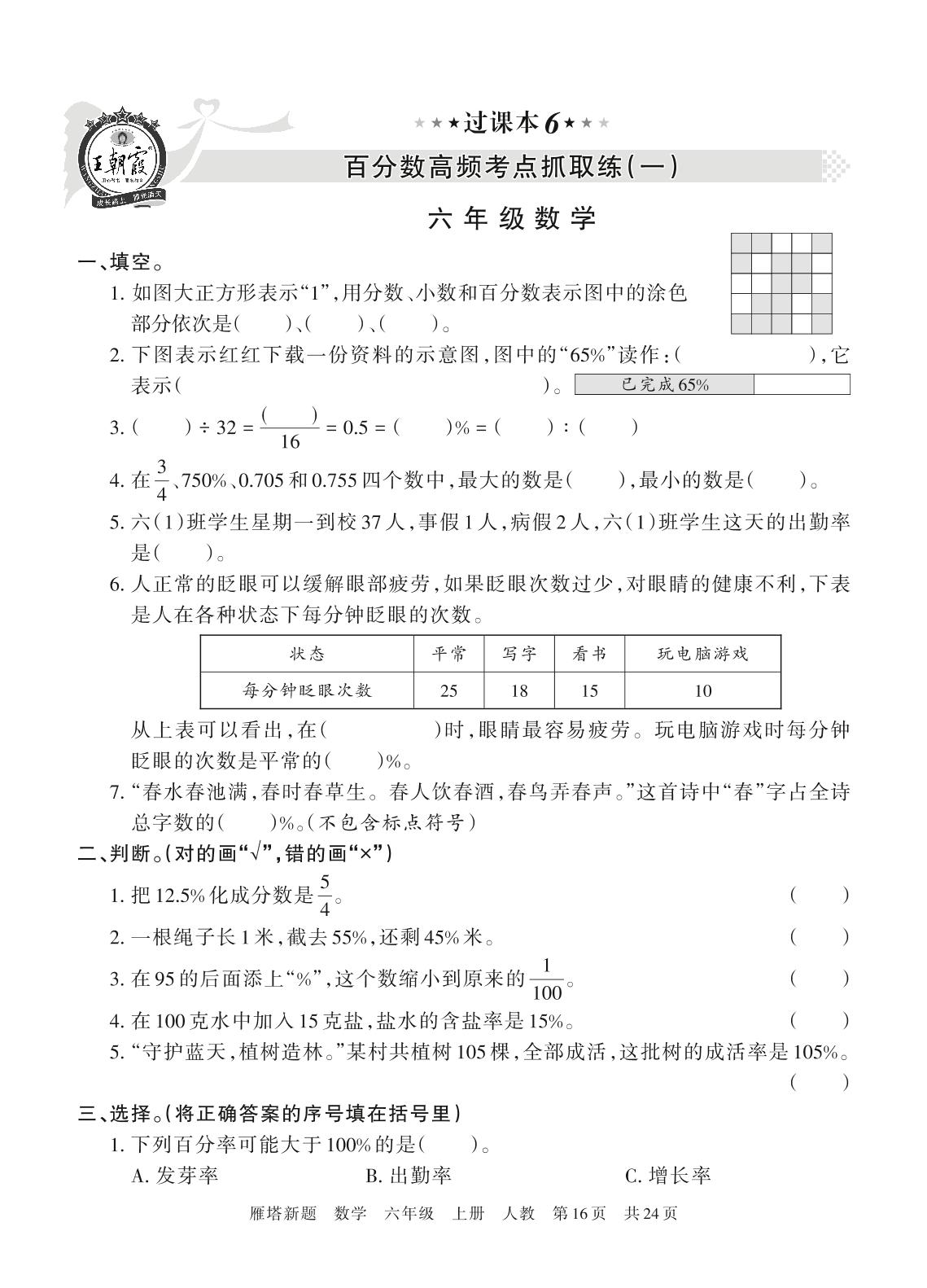 王朝霞期末过课本——百分数高频考点抓取练(一)六年级上册数学(人教版)_R211223104001480【6】
