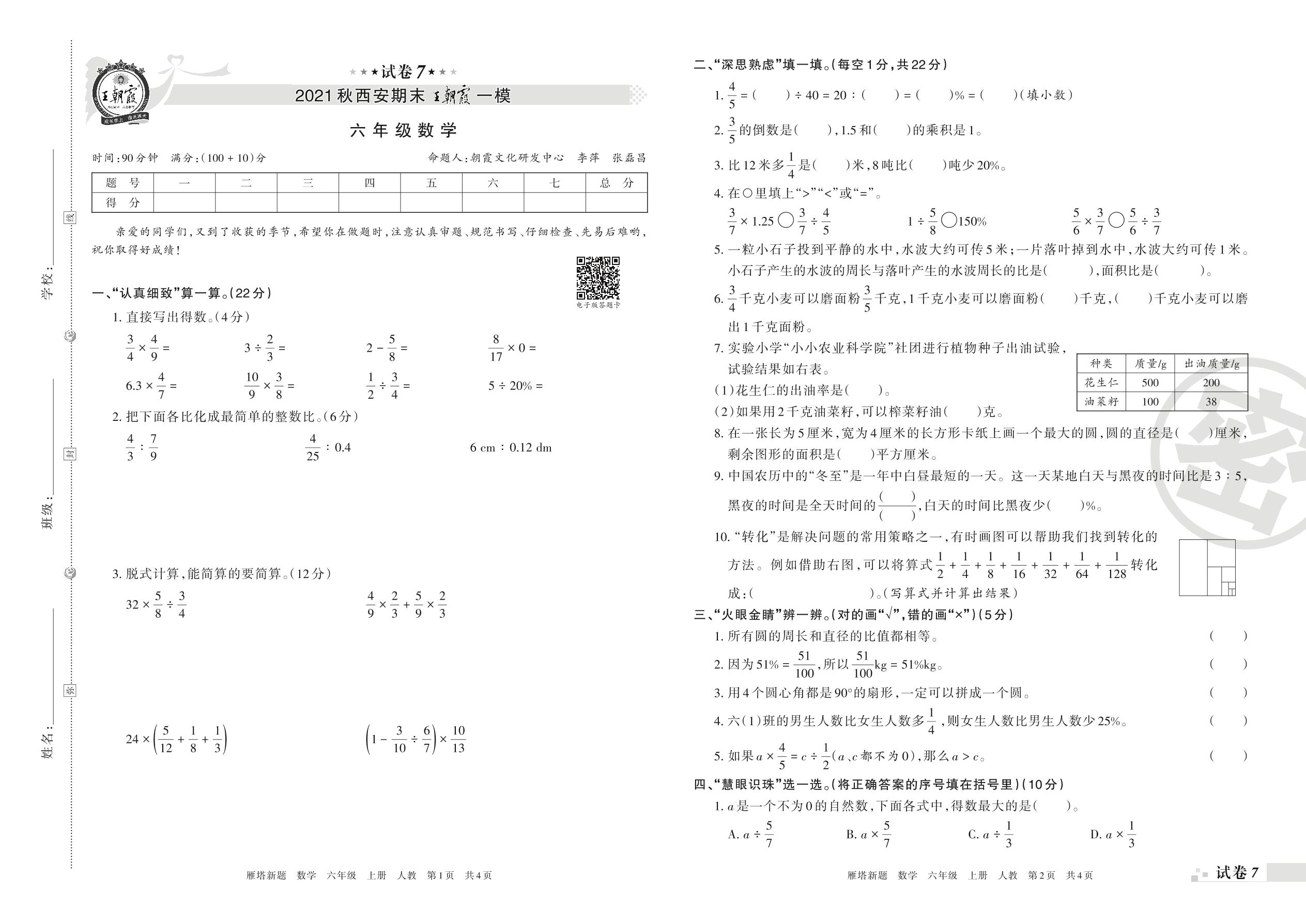 王朝霞期末模拟卷六年级上册数学(人教版)_R211223104002788【7】