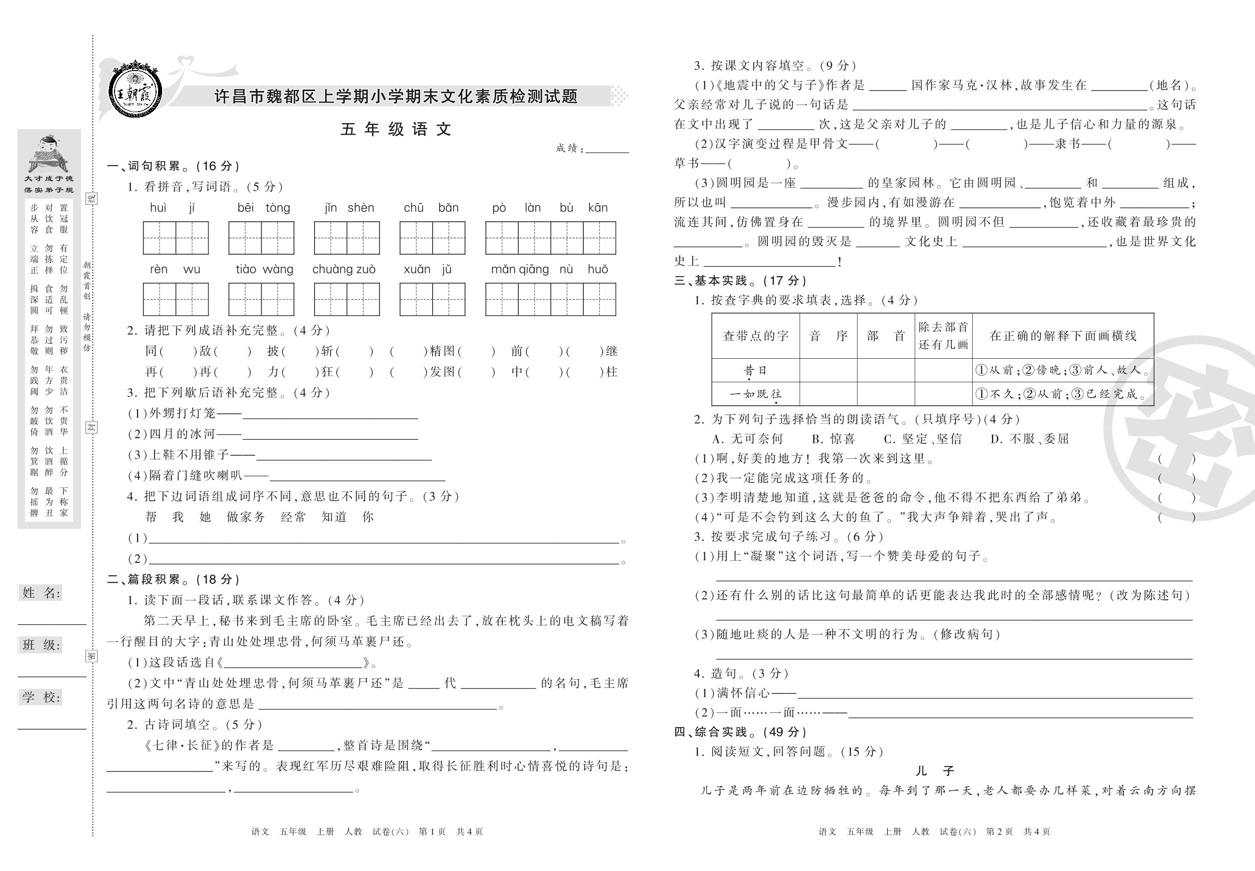 2016-2017学年第一学期许昌市魏都区五年级语文试卷(人教版)【6】